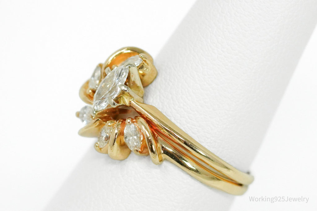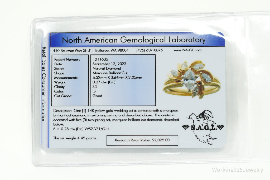 One (1) 14K yellow gold wedding set is centered with a marquise brilliant cut diamond in six-prong setting and described above. The center is accented with five (5) two-pronq set, marquise brilliant cut diamonds described below: