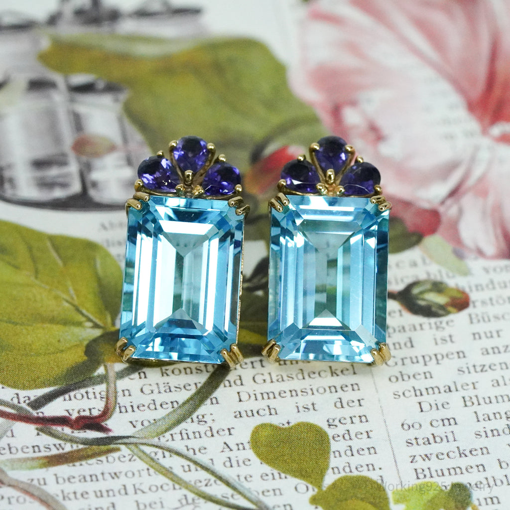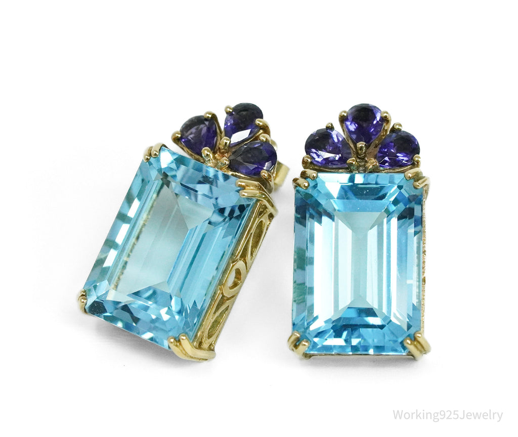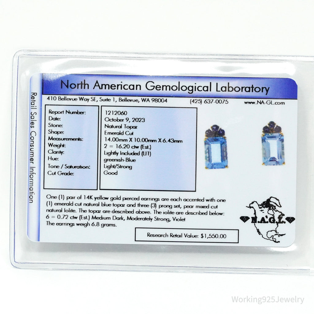 One (1) pair of 14K yellow gold pierced earrings are each accented with one (1) emerald cut natural blue topaz and three (3) prong set, pear mixed cut natural lolite. The topaz are described above. The iolite are described below: 6 = 0.72 ct (Est.) Medium Dark, Moderately Strong, Violet The earrings weigh 6.8 grams. Research Retail Value: $1,550.00 Independent Appraisal Included. Pictured boxes are not included.