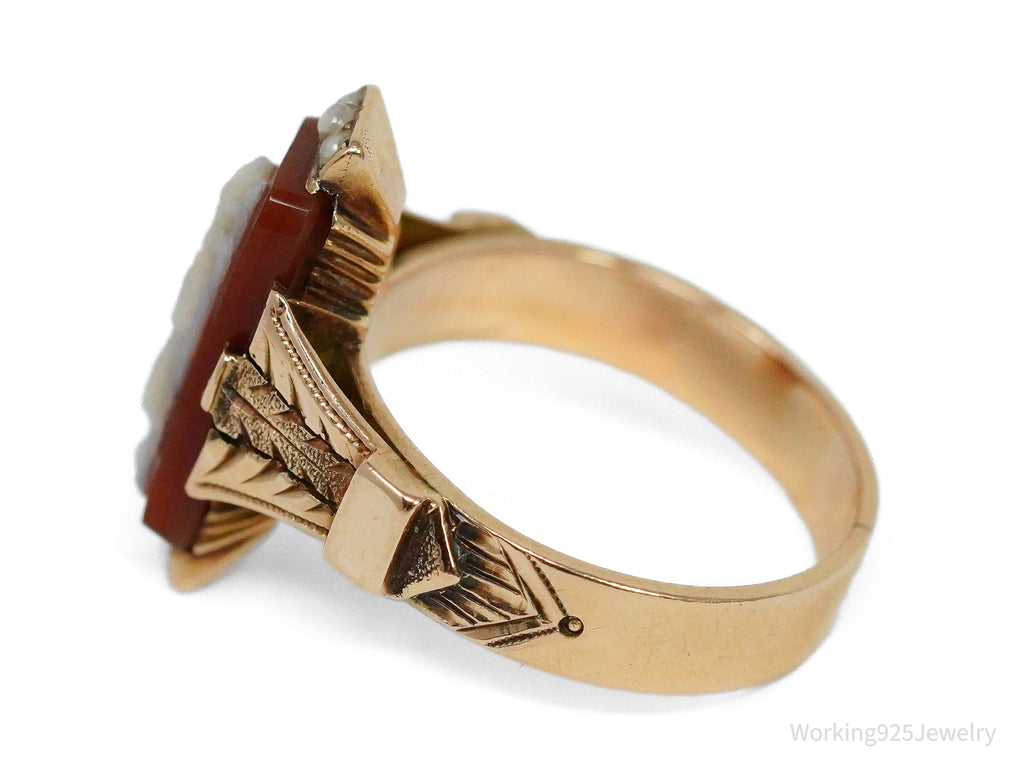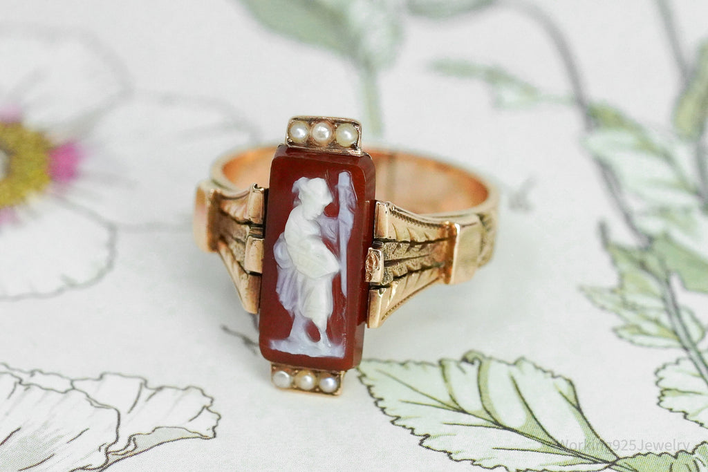 One (1) stamped 14K rose gold ring contains one (1) cameo in a prong setting. Six (6) seed pearls are bead set at the top and engraved details accent the shoulders. The ring measures 18.6mm at the top, rises 6.1mm above the finger, tapering to 4.1mm wide and 0.9mm thick at the base. The ring weighs 4.63 grams. Research Retail Value: $1,425.00