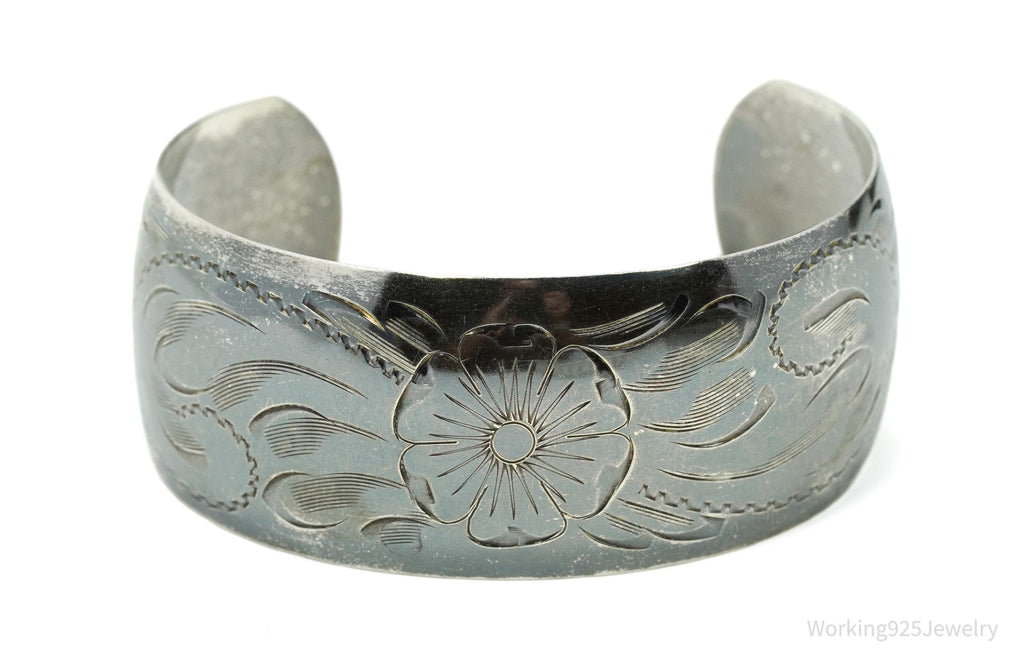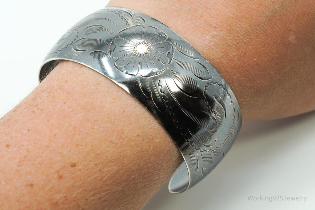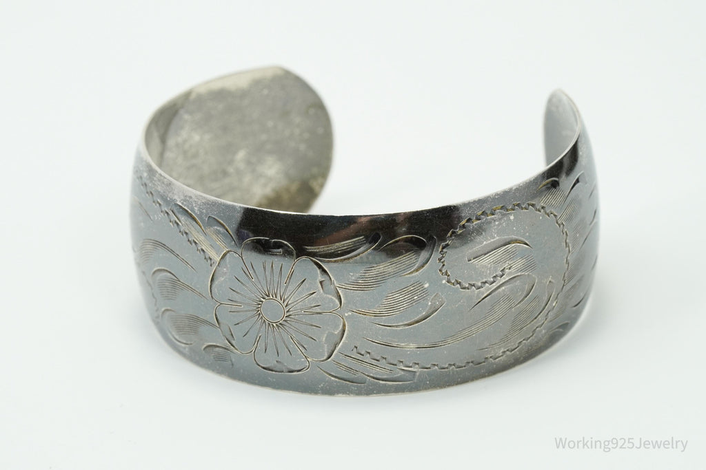 Antique Art Nouveau Floral Etched Sterling Silver Cuff Bracelet - 7 5/8"