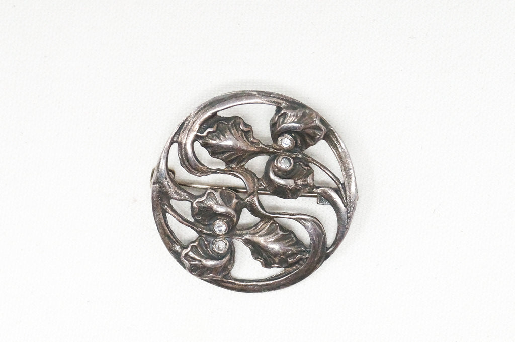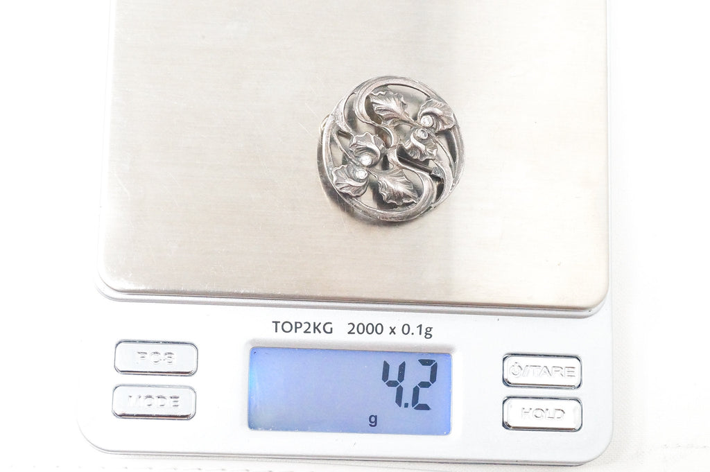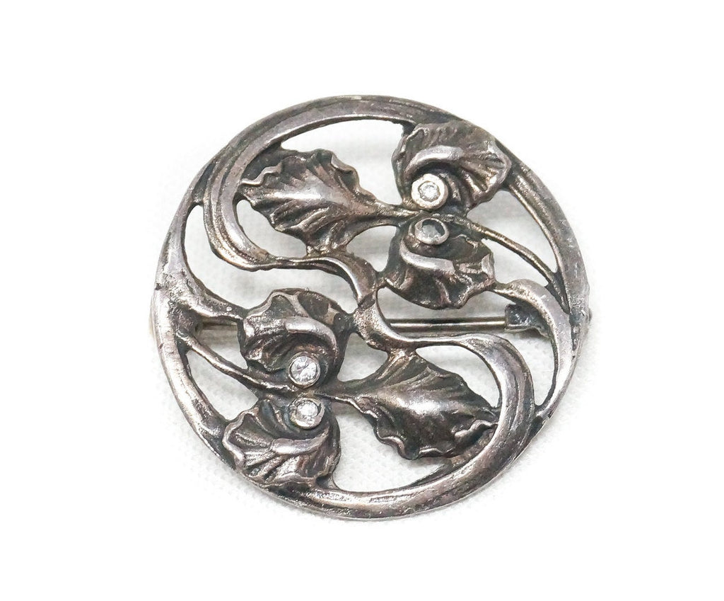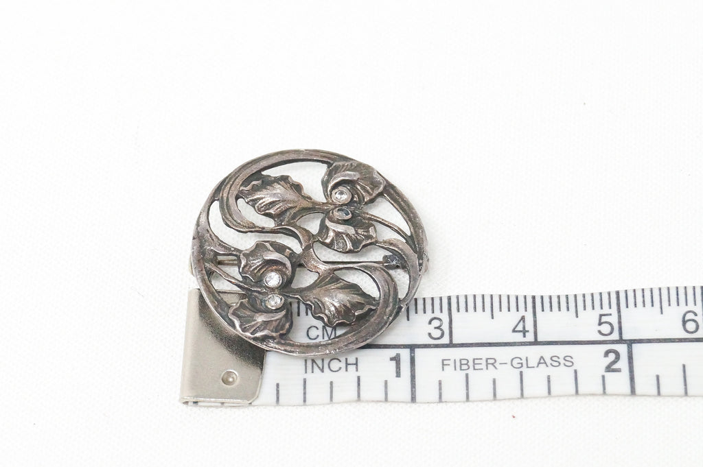 Antique Art Nouveau Motif Floral CZ Sterling Silver Brooch Pin