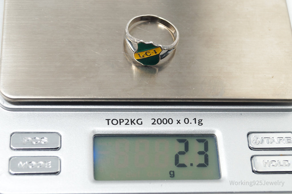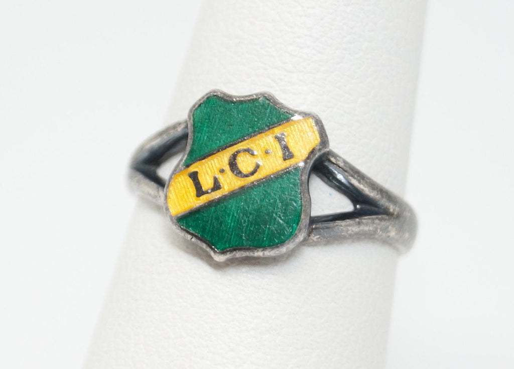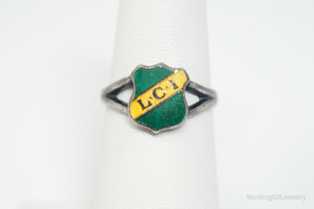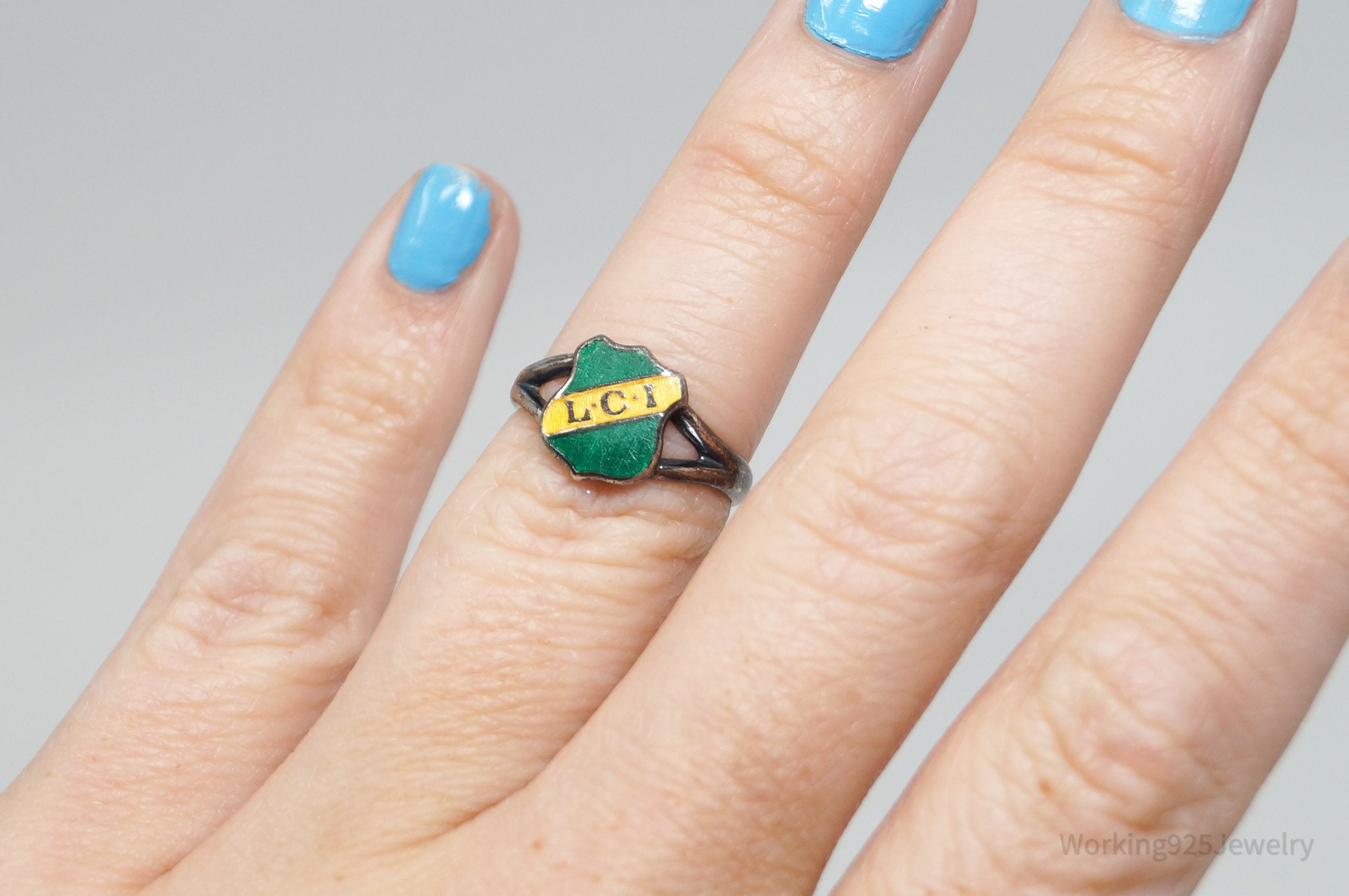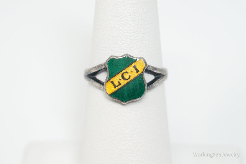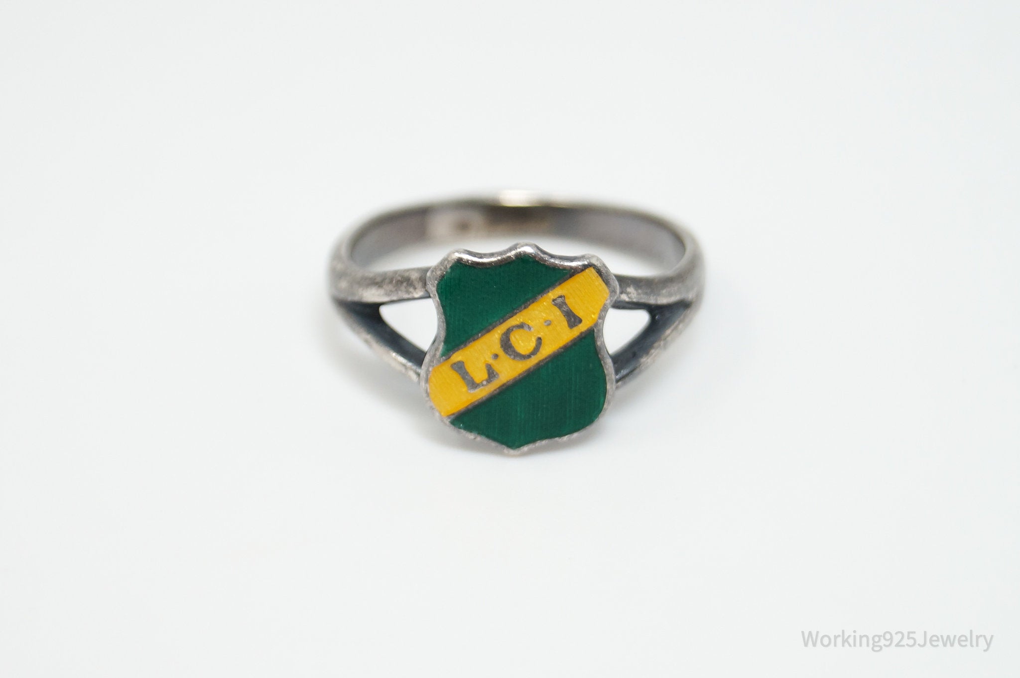 Antique Enamel LCI Shield Sterling Silver Ring - Sz 5.5