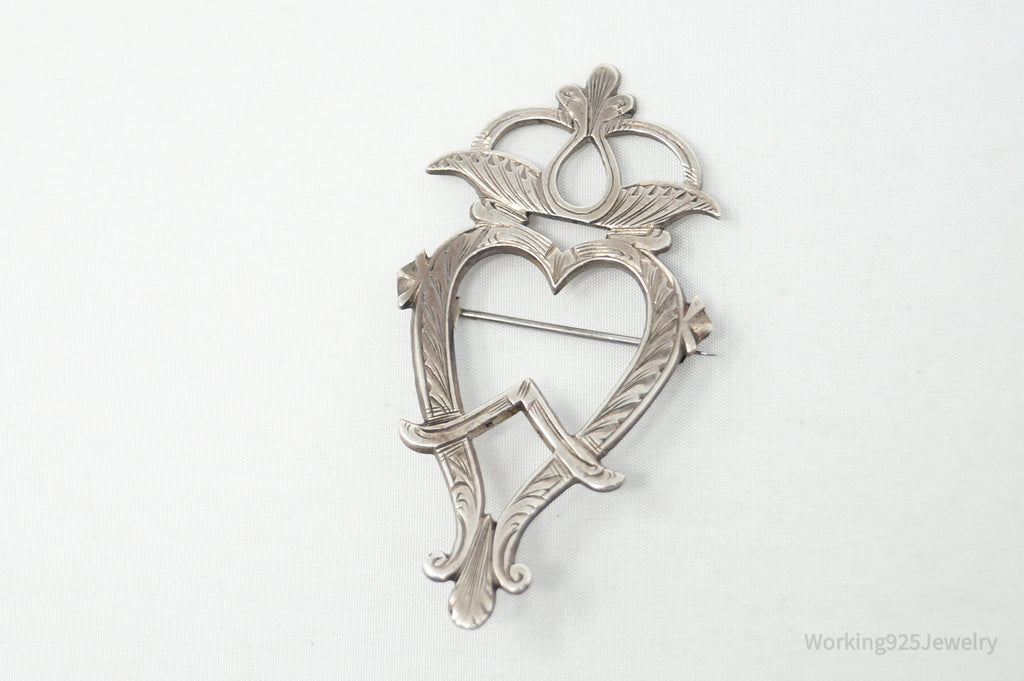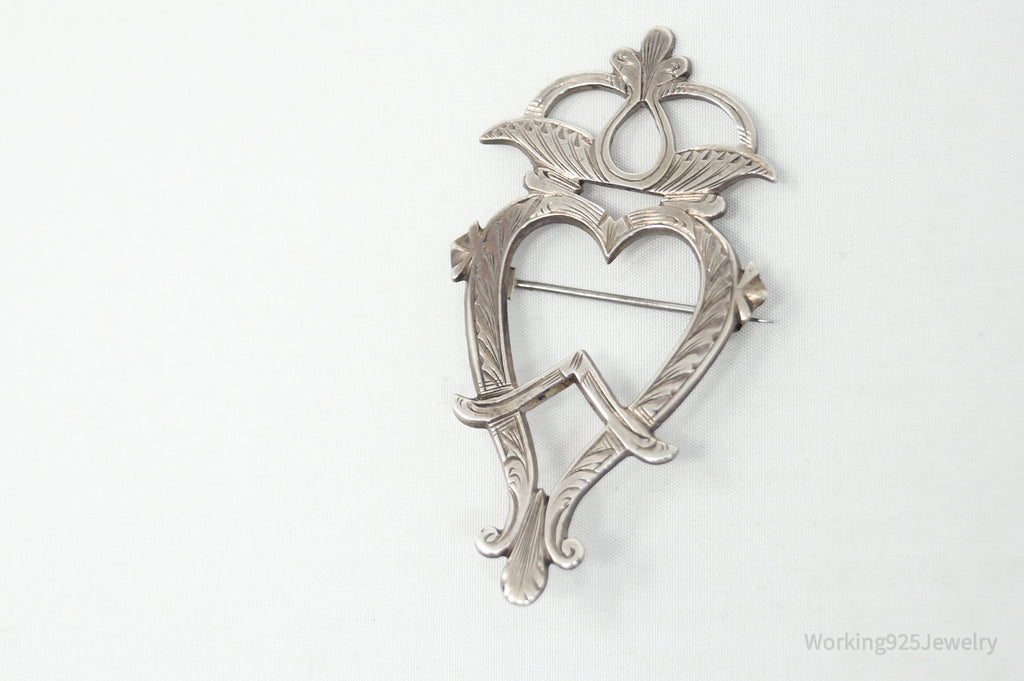 Antique Etched Floral Heart Silver Brooch Pin