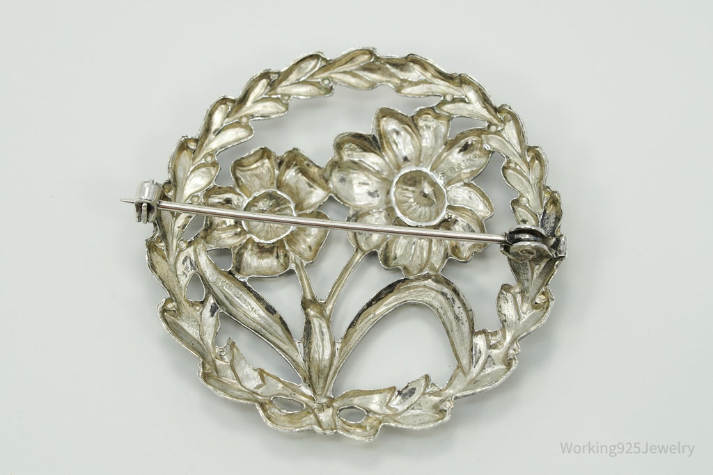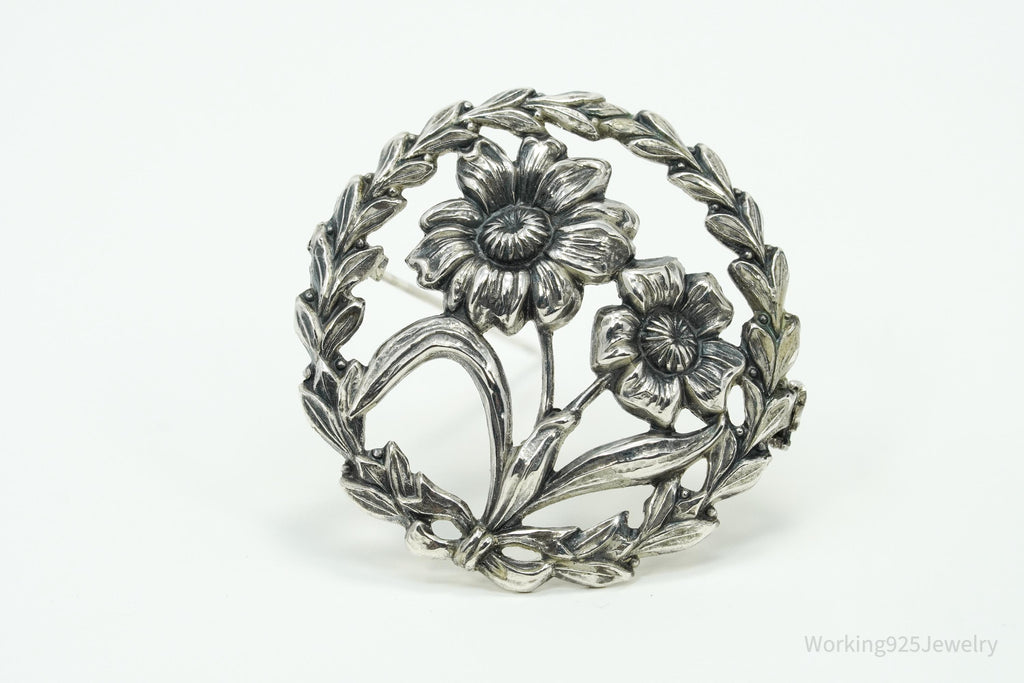 Antique Floral Wreath Sterling Silver Brooch Pin
