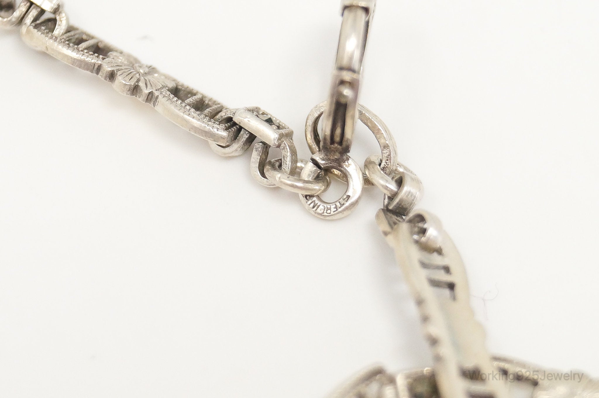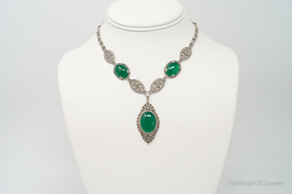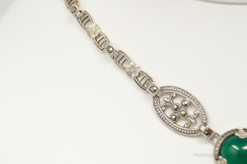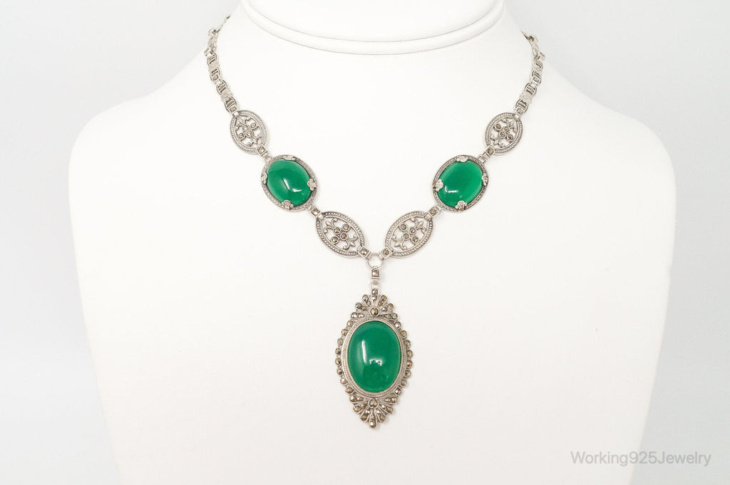 Antique Green Chrysoprase Marcasite Sterling Silver Necklace