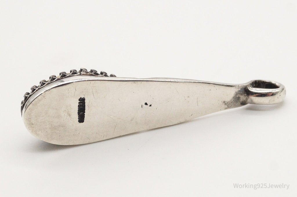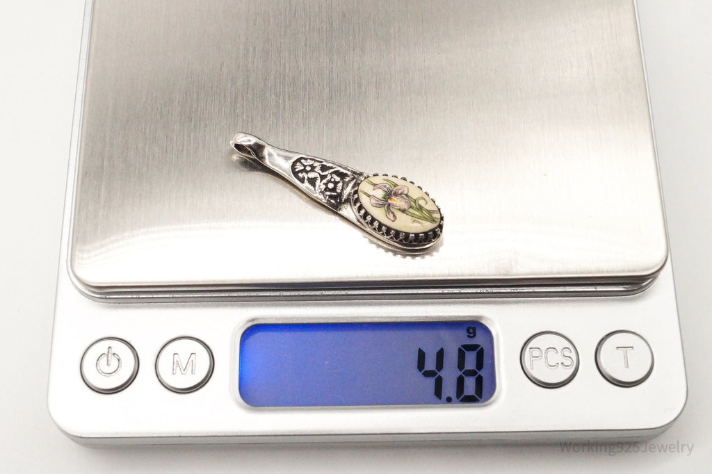 Antique Hand Painted Flower Faux Bone Sterling Silver Pendant