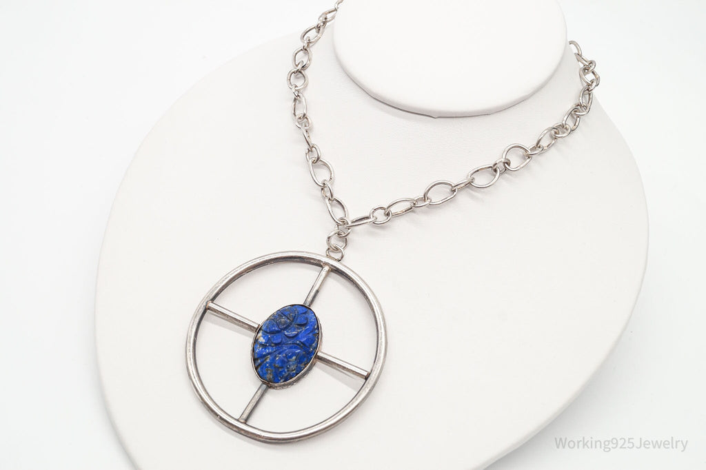 Antique Lapis Lazuli Modernist Style Large Pendant Silver Necklace