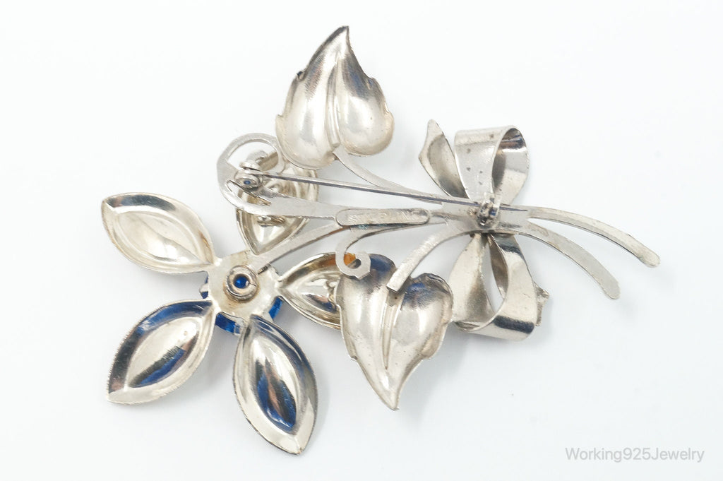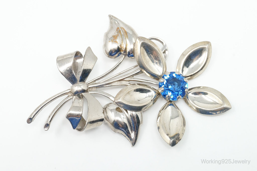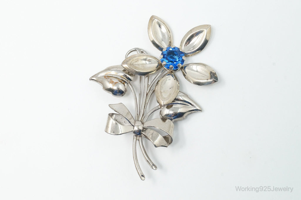 Antique Large Blue Art Glass Flower Sterling Silver Brooch Pin