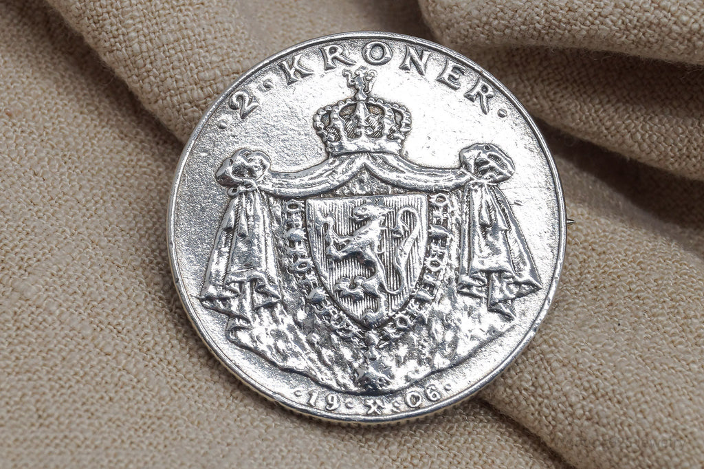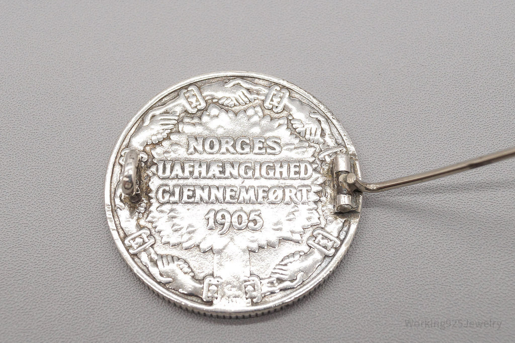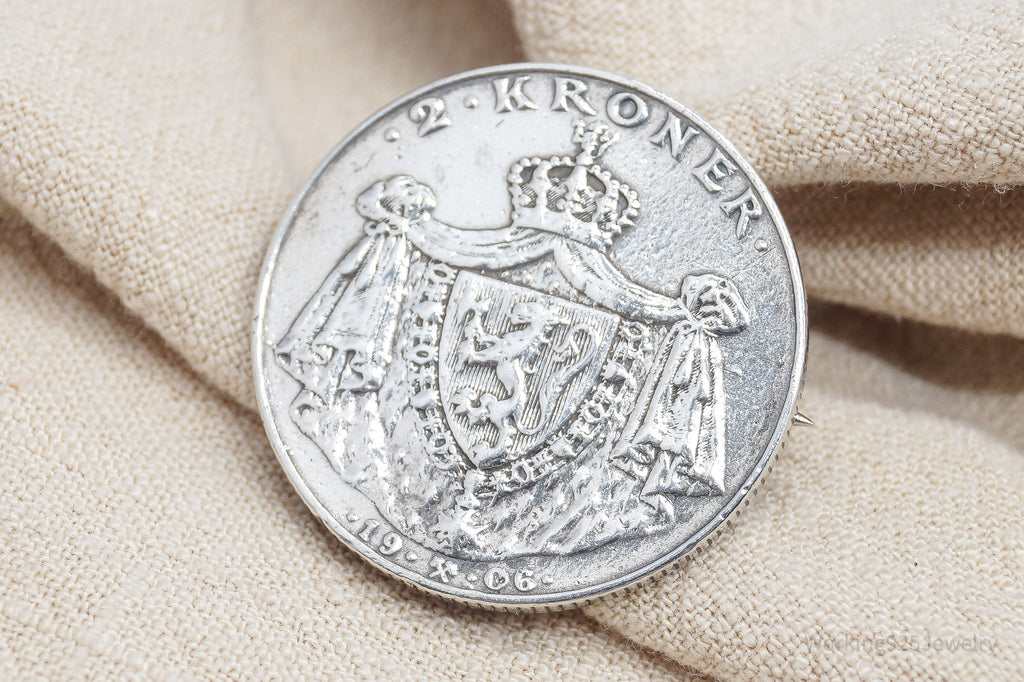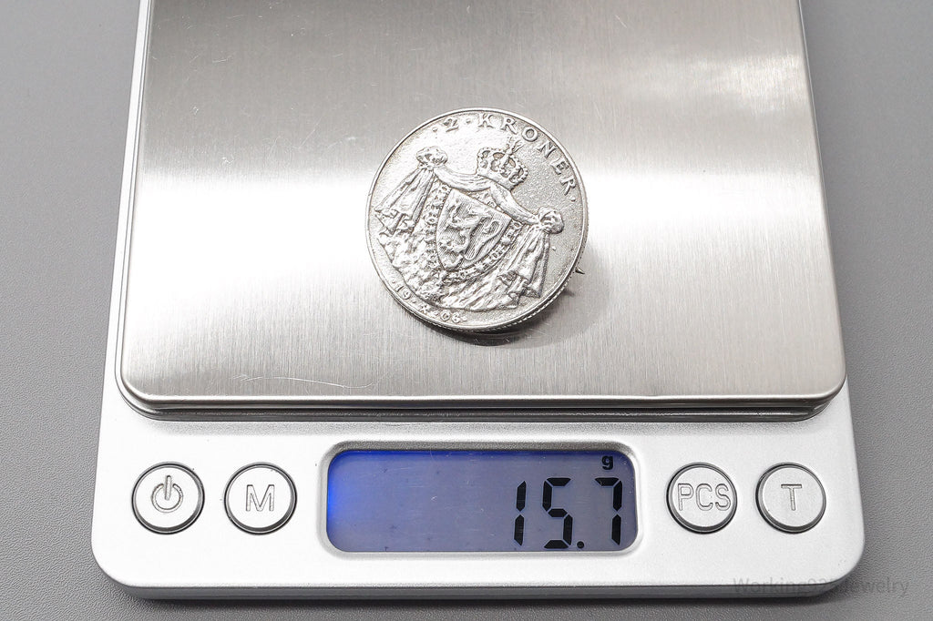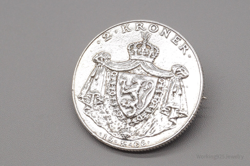 Antique Norway 1906 Silver 2 Kroner Silver Coin Brooch Pin