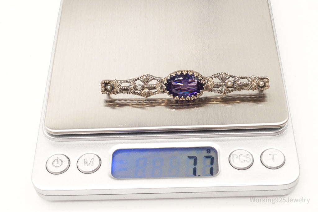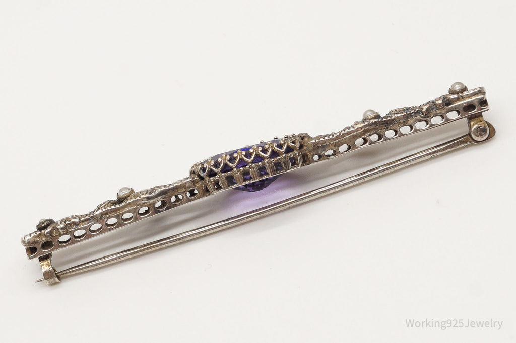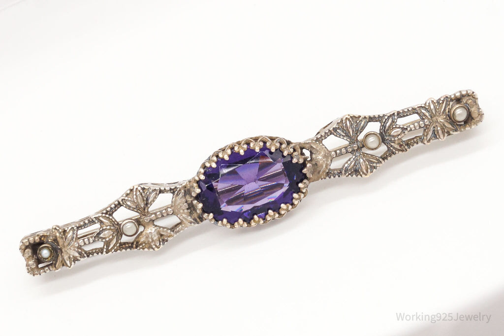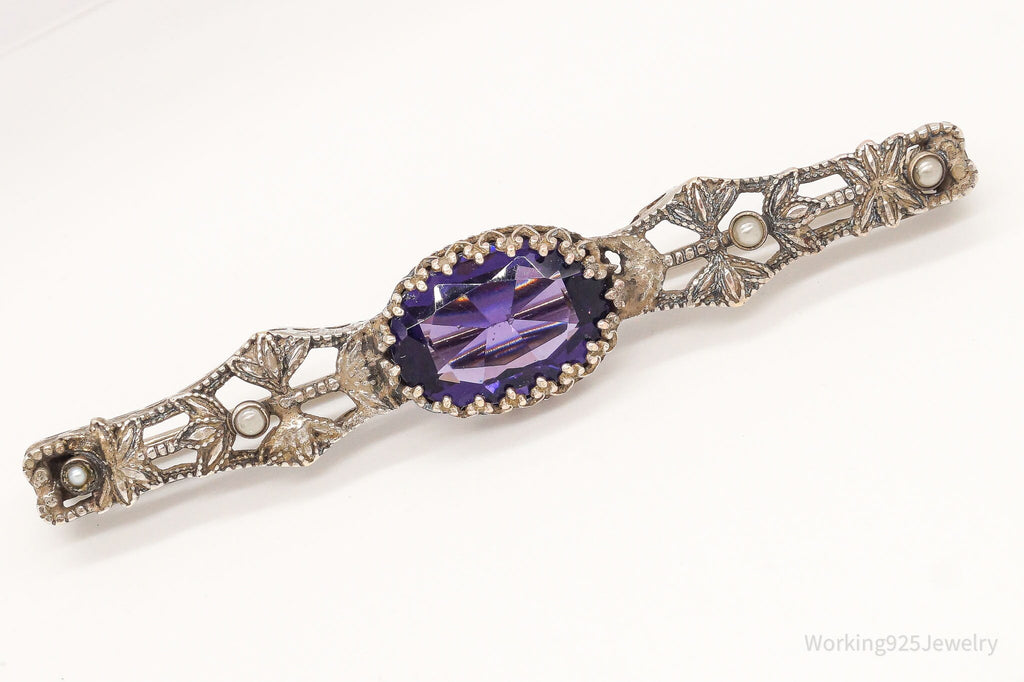 Antique Victorian Glass Seed Pearls Silver Brooch Pin Bar