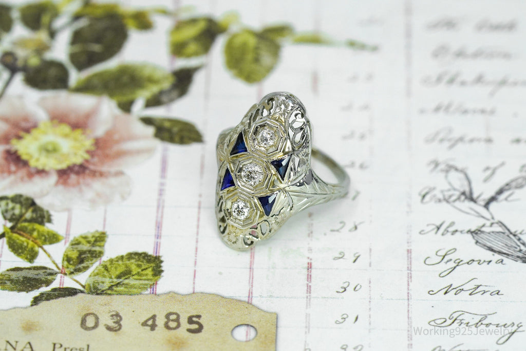 Circa Art Deco era 18k white gold ring is centered with three (3) old European cut diamonds described above and four (4) bezel set, triangular French cut laboratory grown blue sapphires measuring 4.0mm X 2.5mm. The ring weighs: 3.66 grams. Research Retail Value: $2,700.00 Independent Appraisal Included. Pictured boxes are not included.