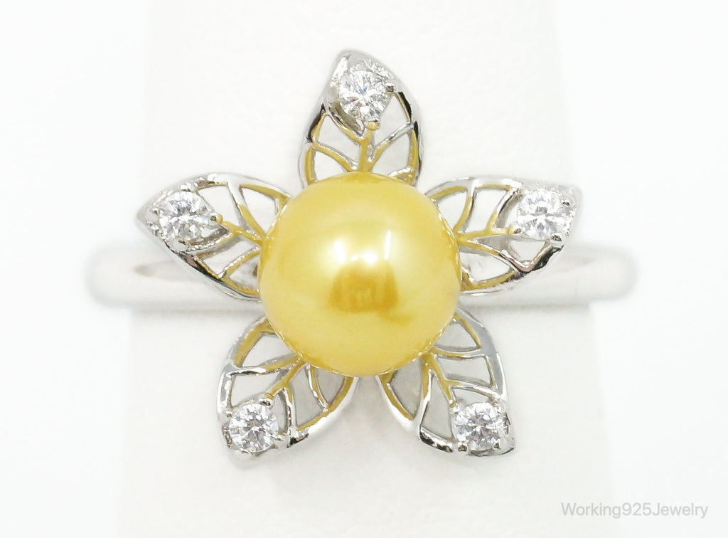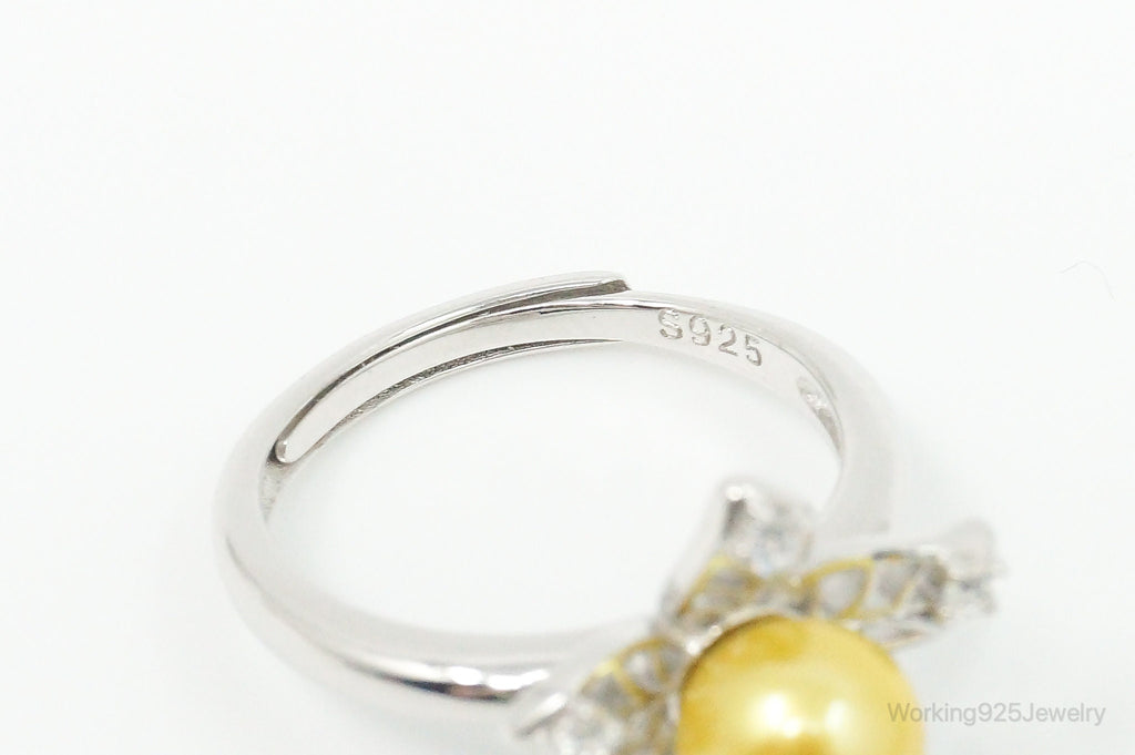 Faux Yellow Pearl Cubic Zirconia Flower Sterling Silver Ring SZ 5.75 Adjustable