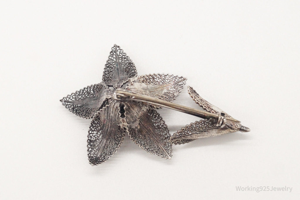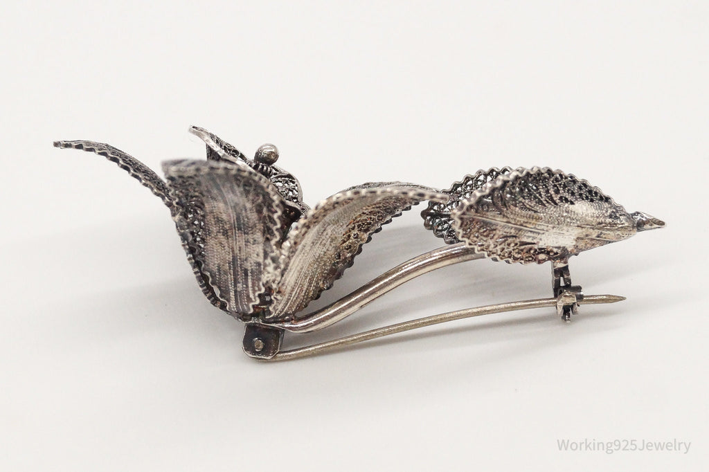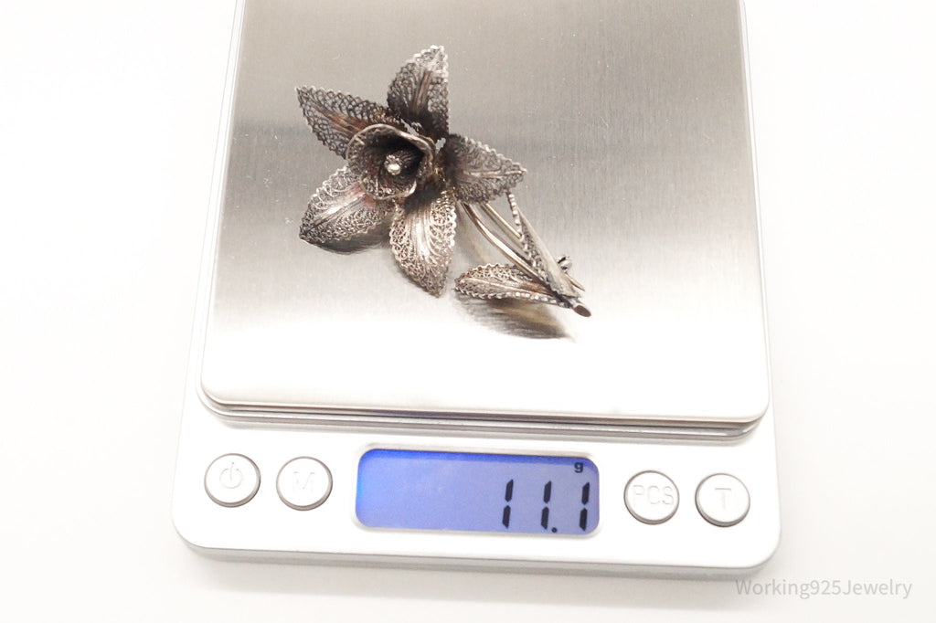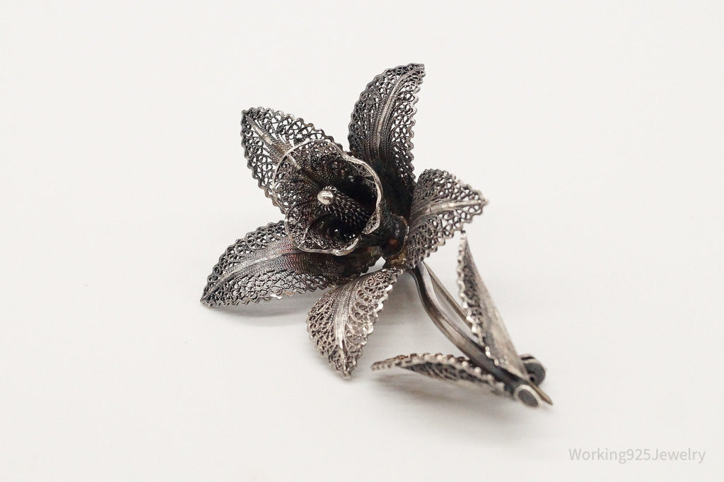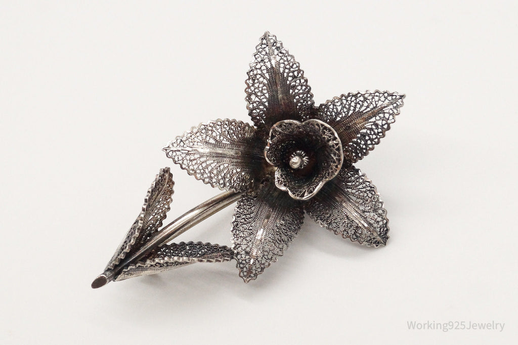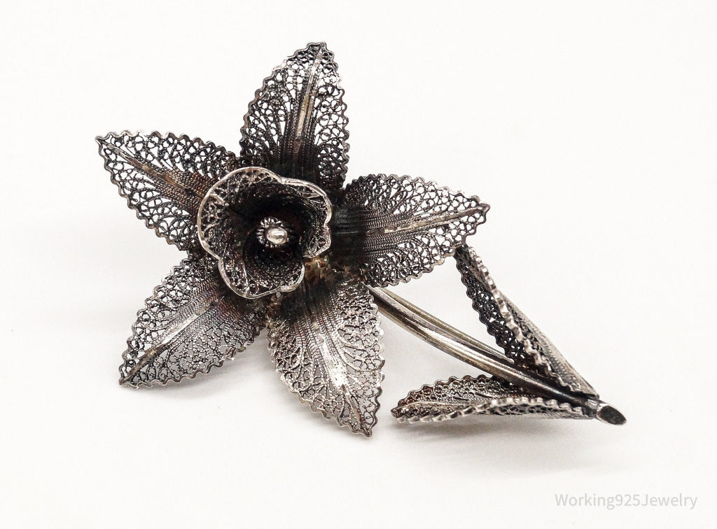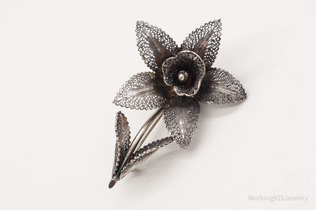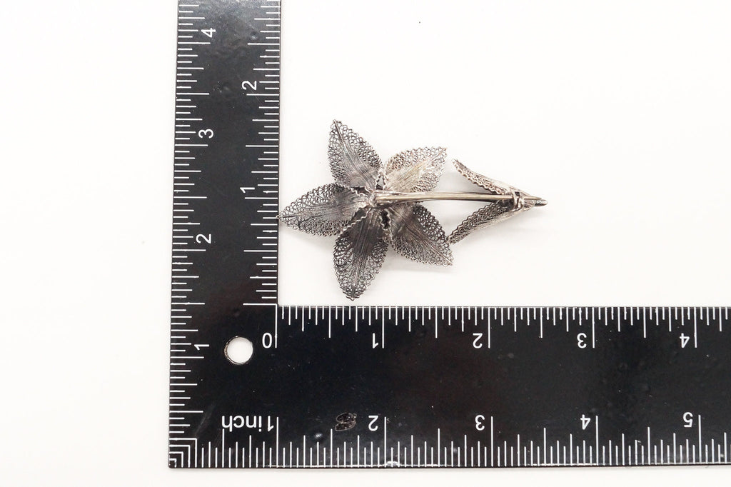 Large Antique Filigree Flower Silver Brooch Pin