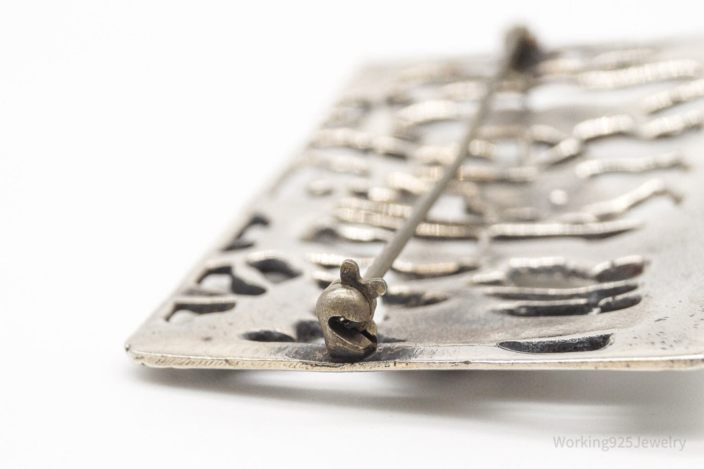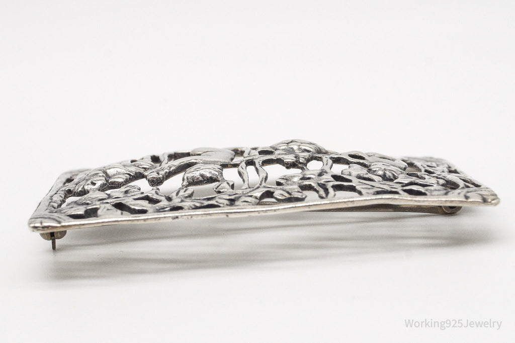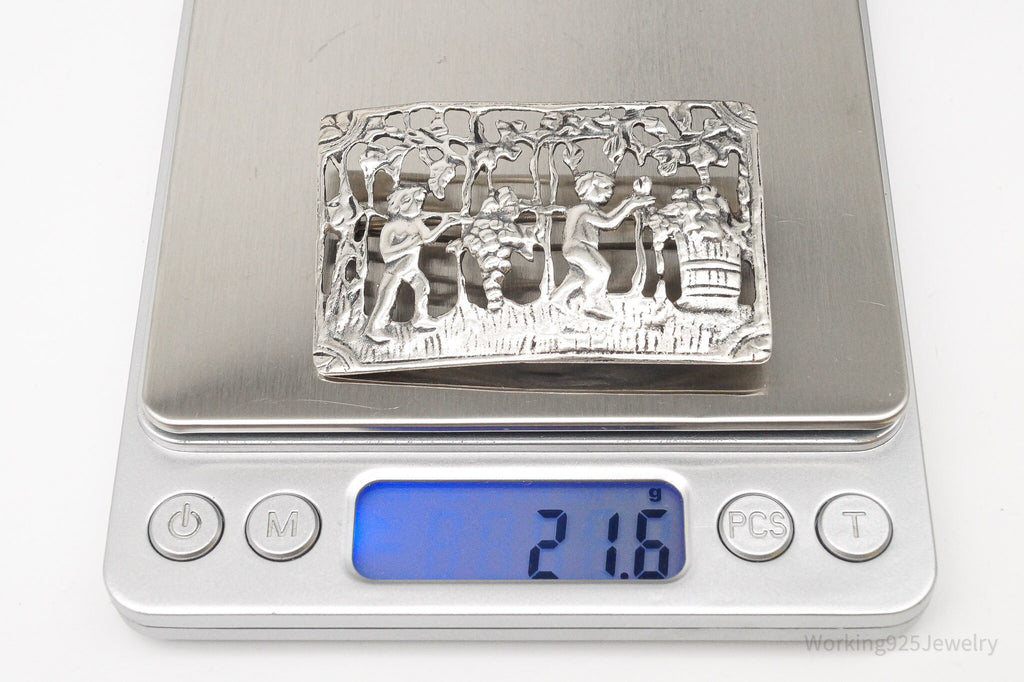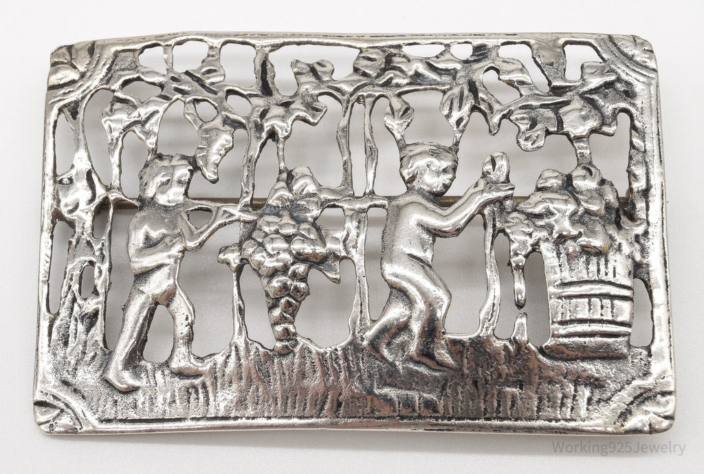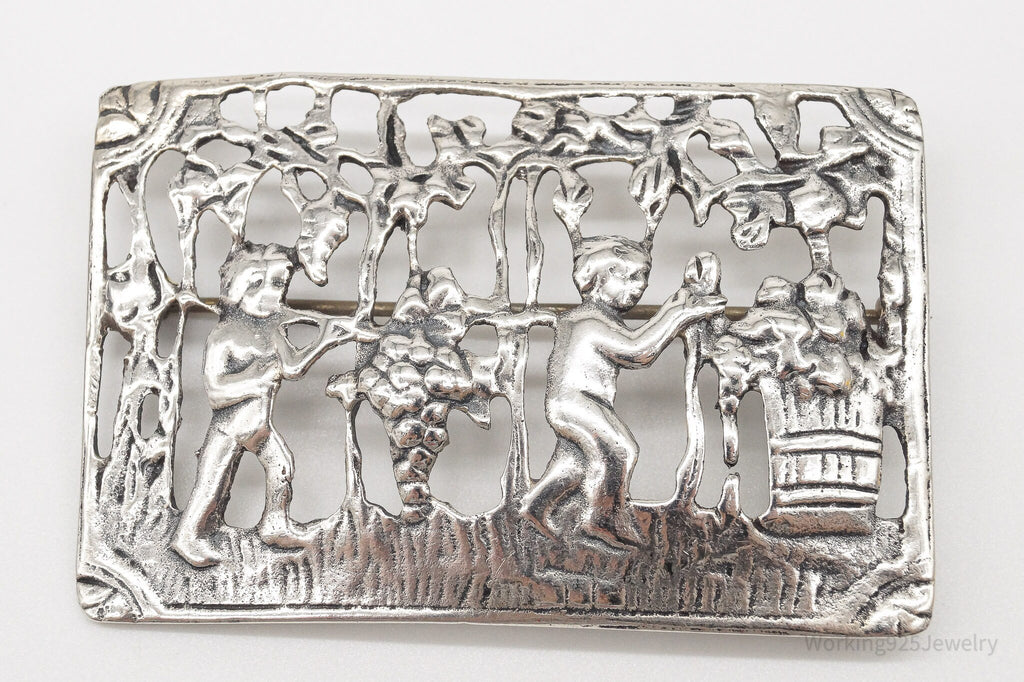 Large Rare Antique Wine Harvest / Making Wine Sterling Silver Brooch Pin