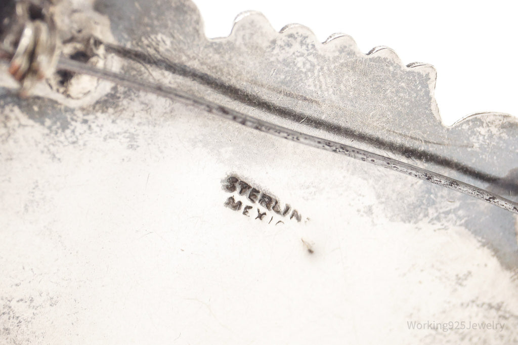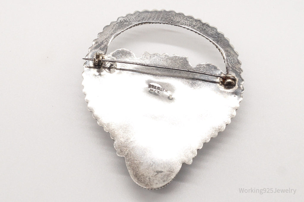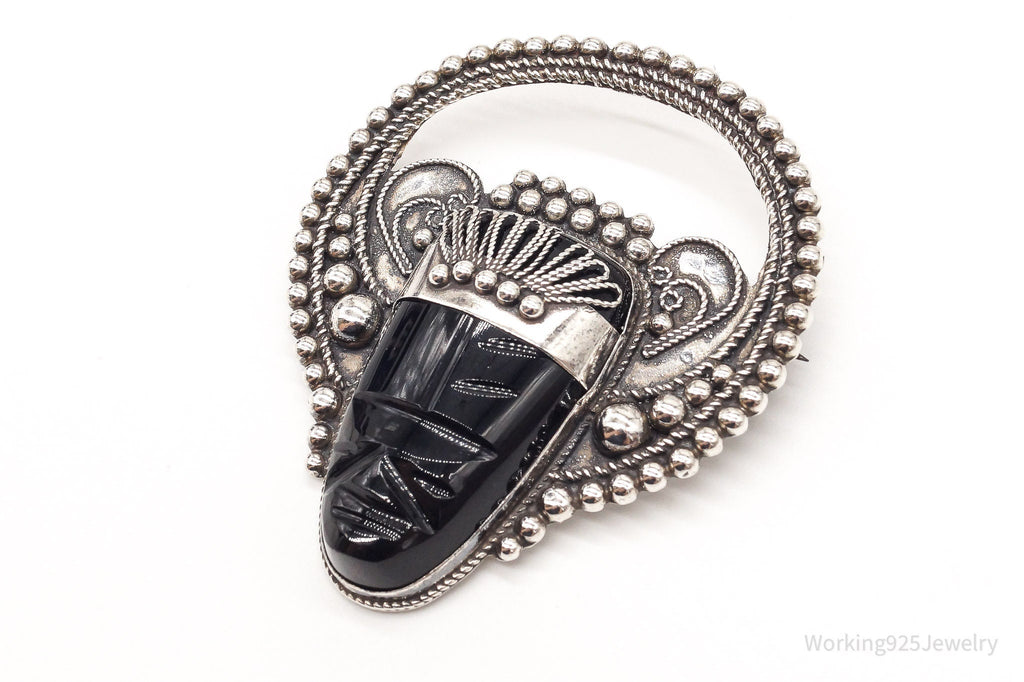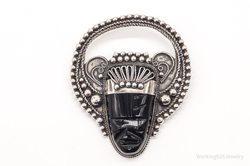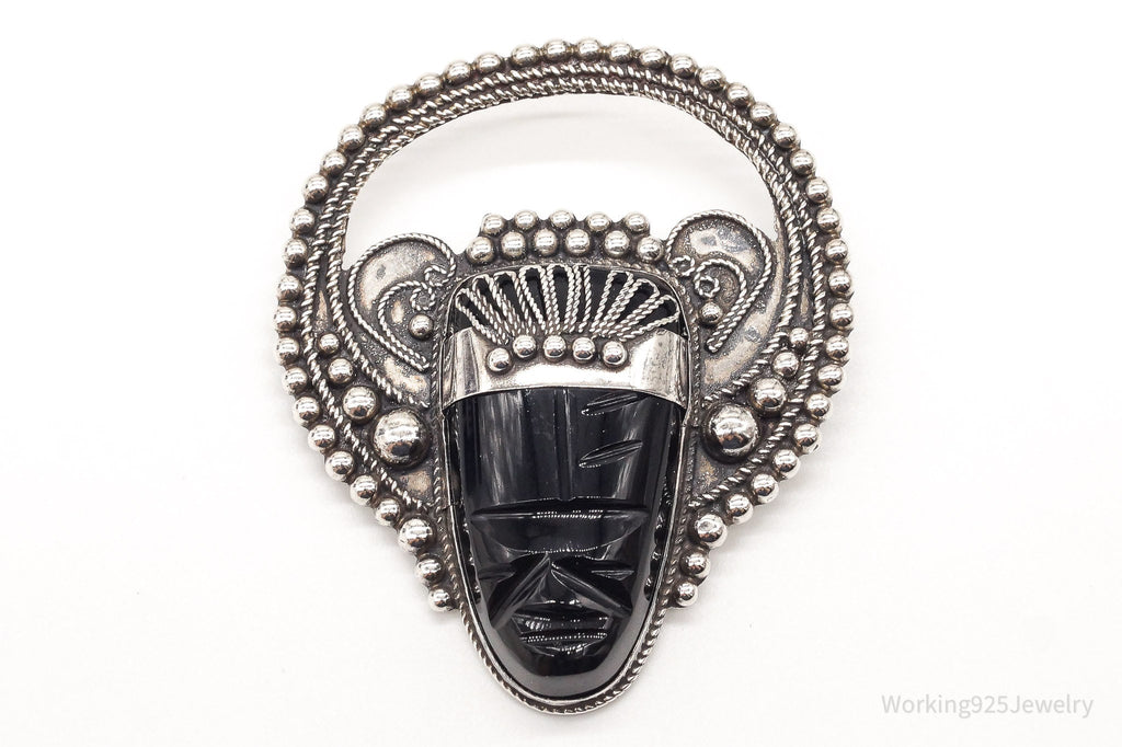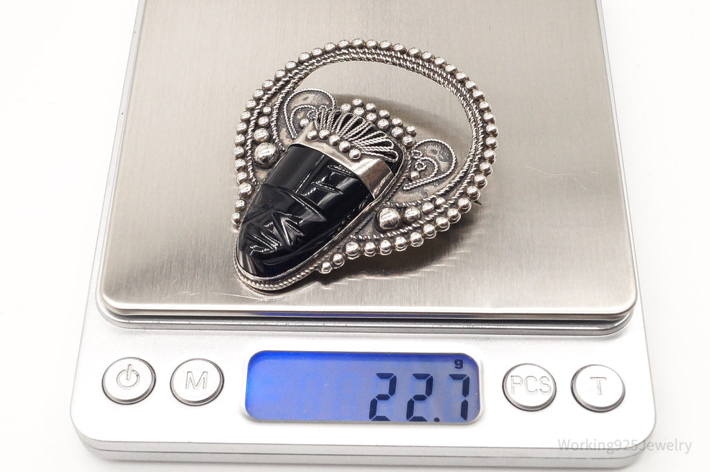 Large Vintage Mexico Carved Black Onyx Tribal Mask Sterling Silver Brooch Pin
