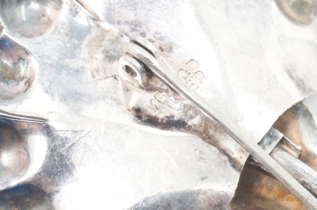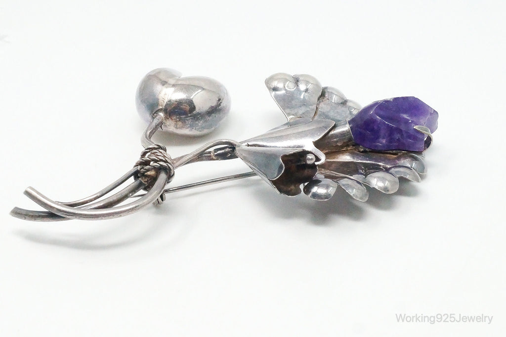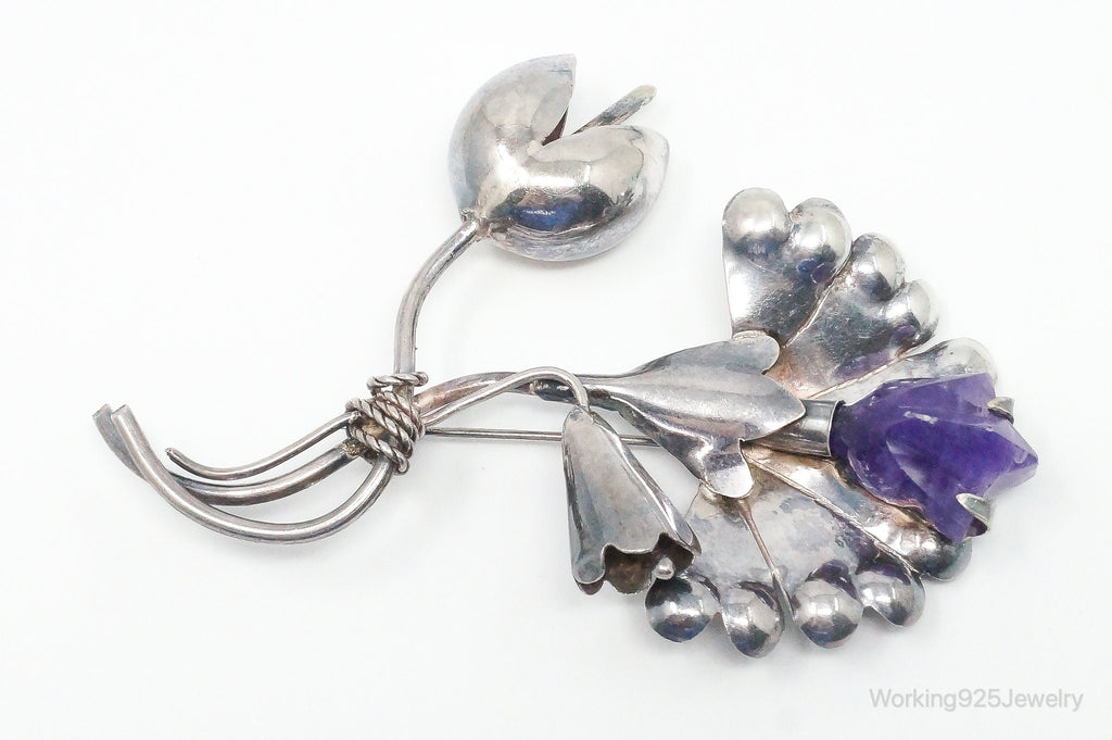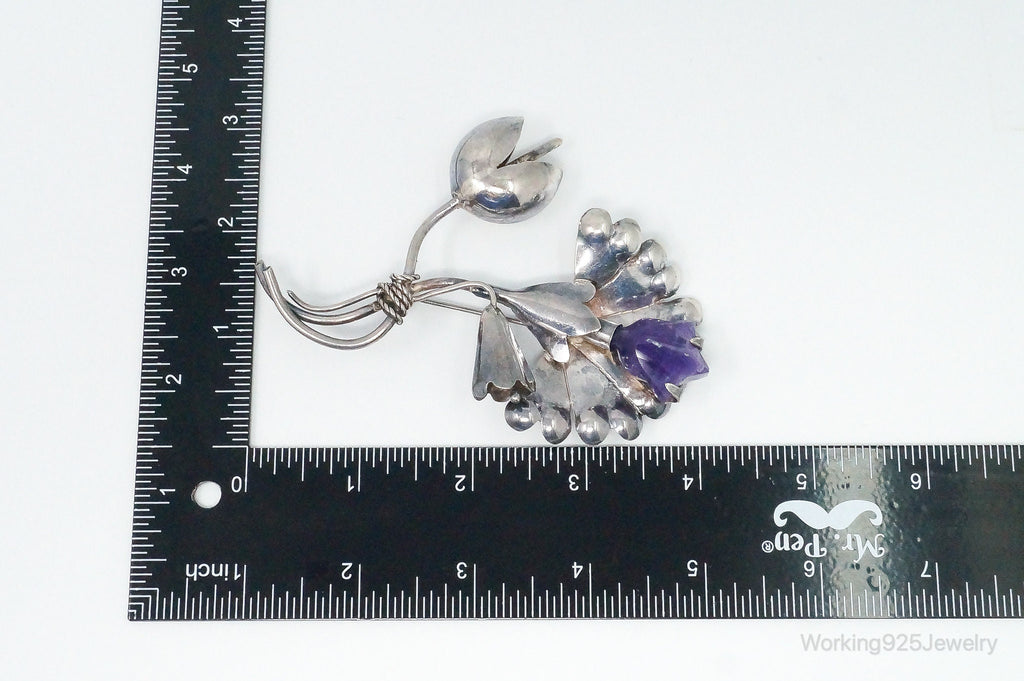 Large Vintage Mexico Modernist Amethyst Flower Sterling Silver Brooch Pin