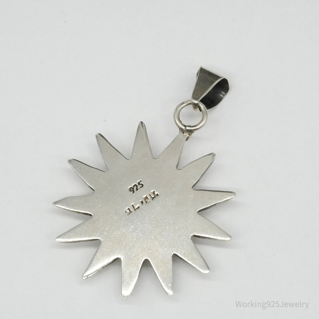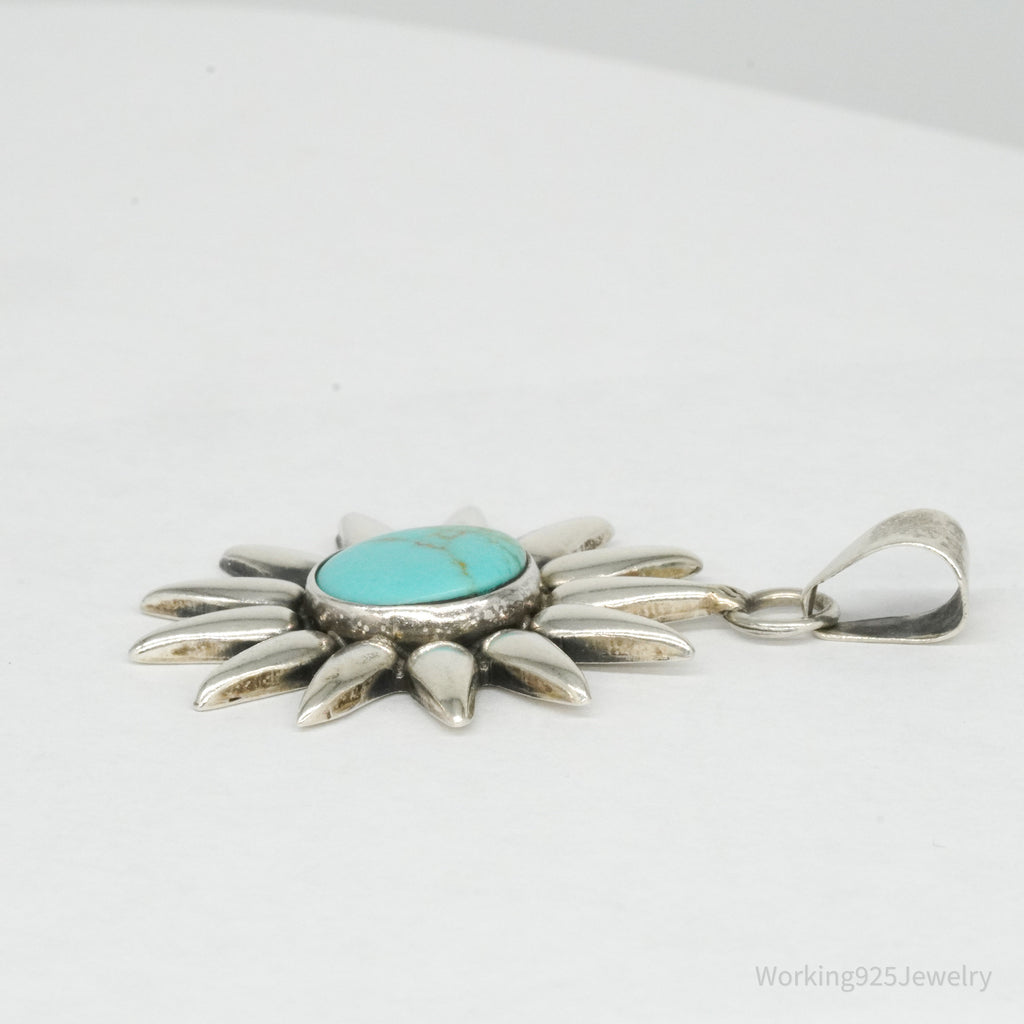 Large Vintage Mexico Turquoise Sun Sterling Silver Pendant 2"