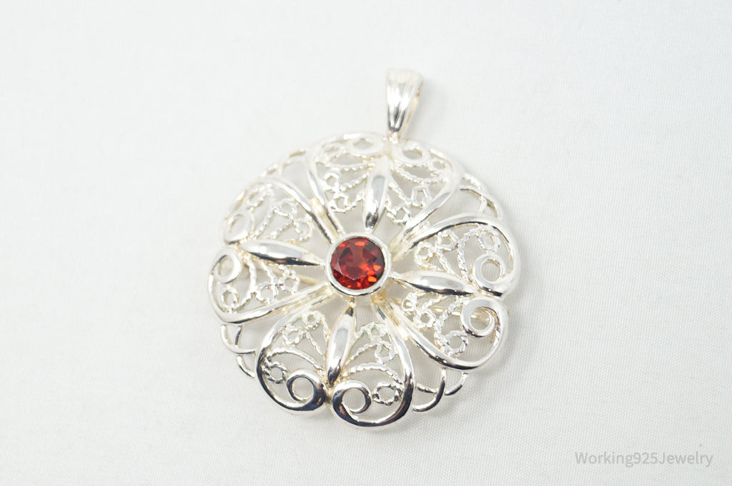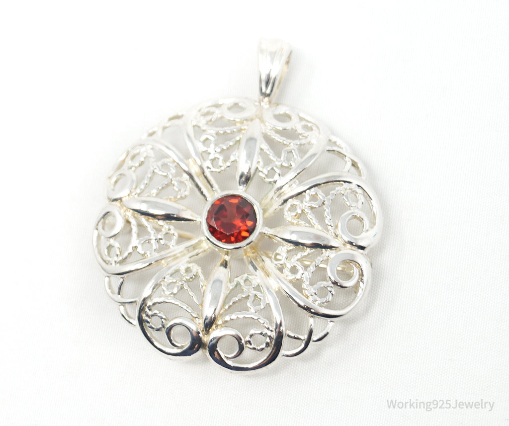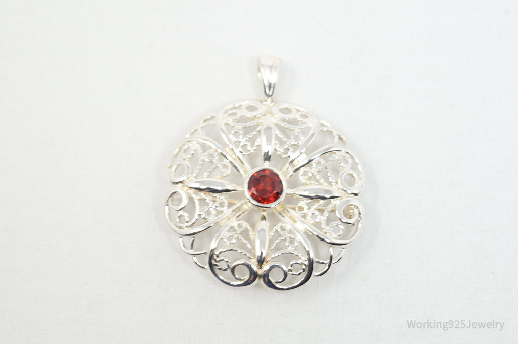 Large Vintage Red Garnet Floral Sterling Silver Brooch Pendant