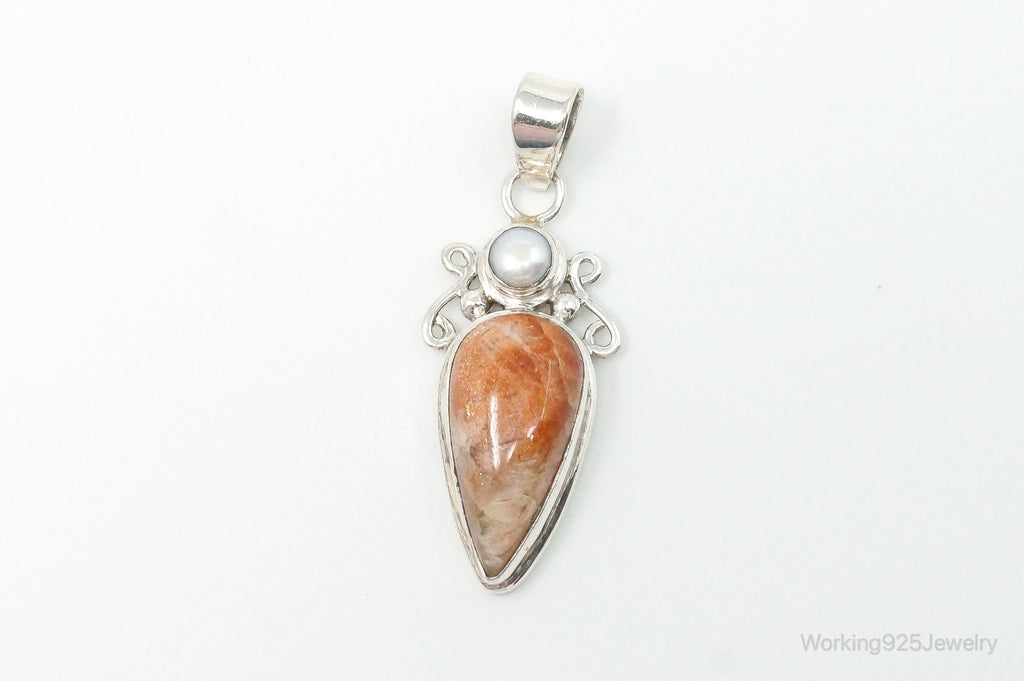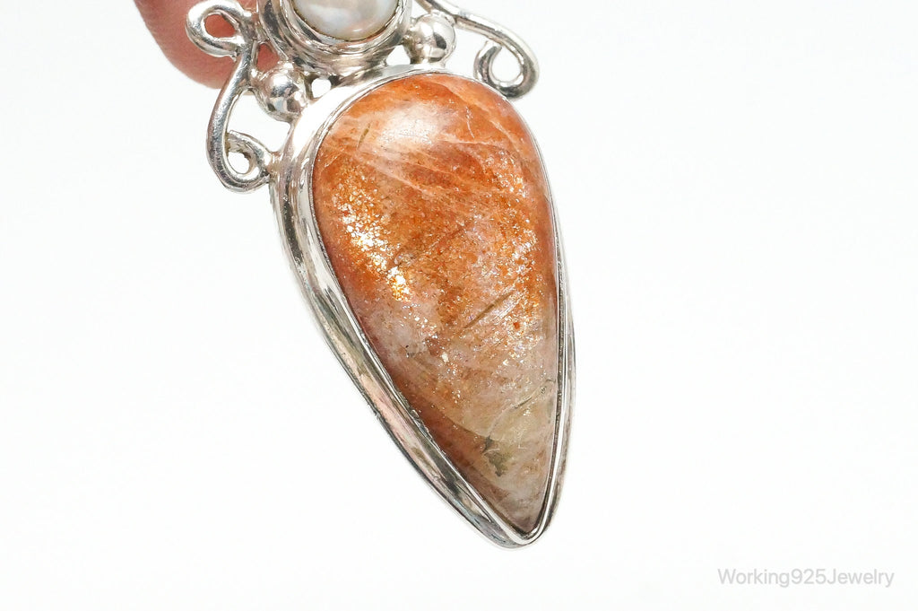 Large Vintage Sunstone Pearl Sterling Silver Pendant