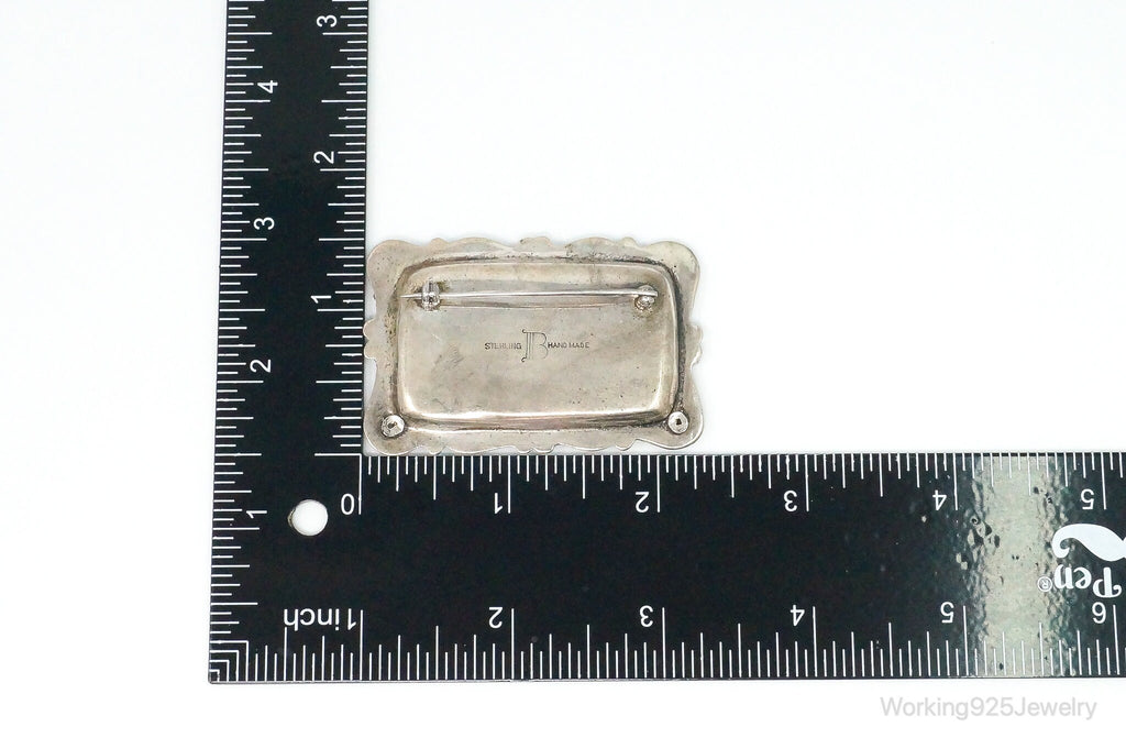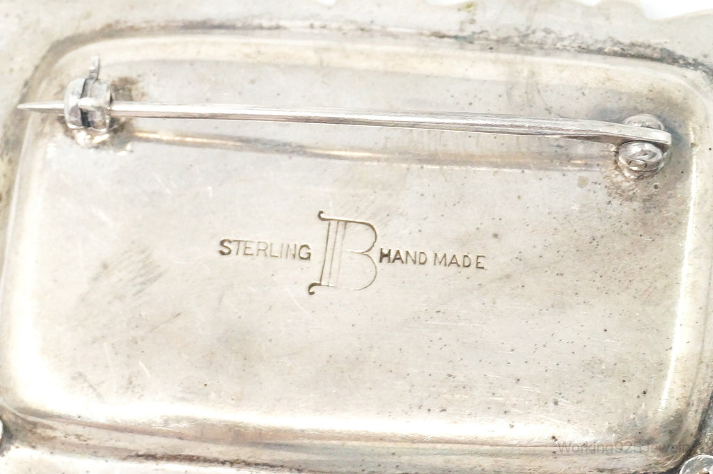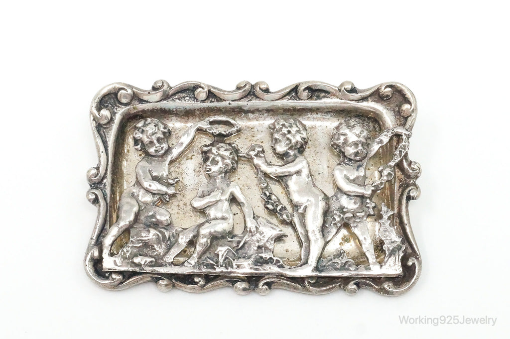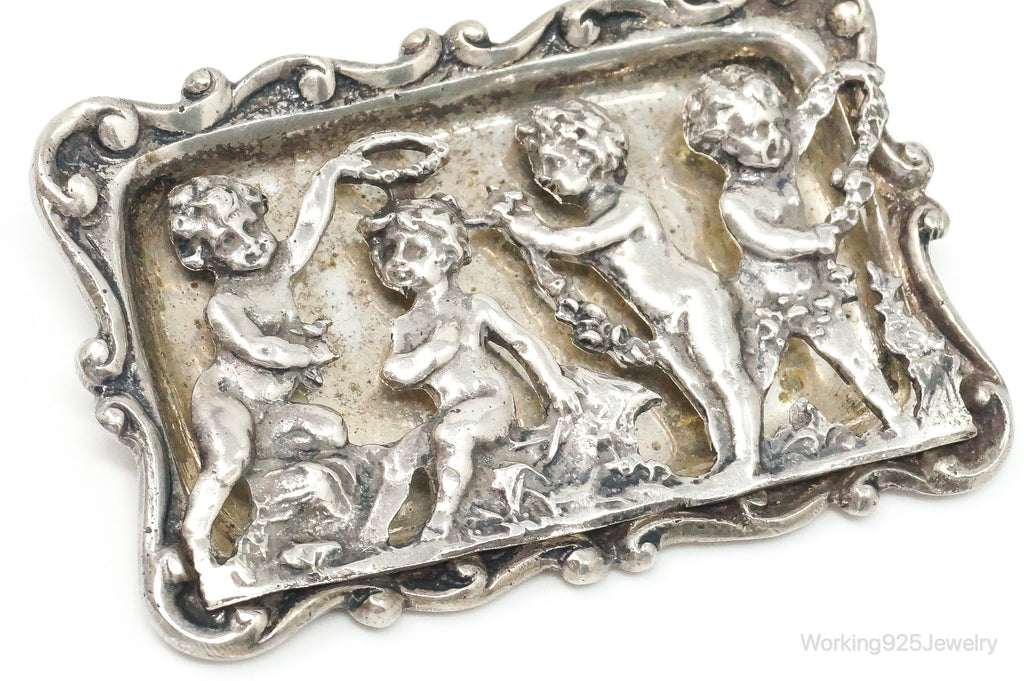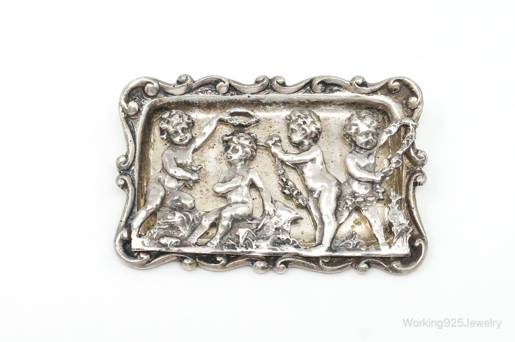 Rare Antique Handmade Cherubs With Garland Sterling Silver Brooch Pin
