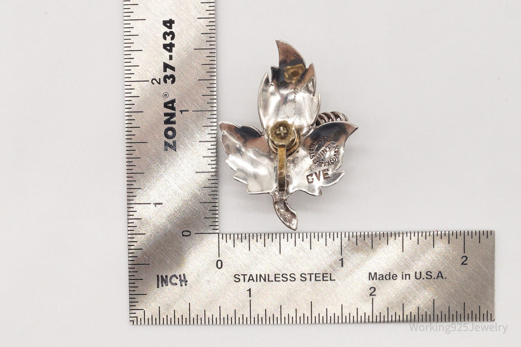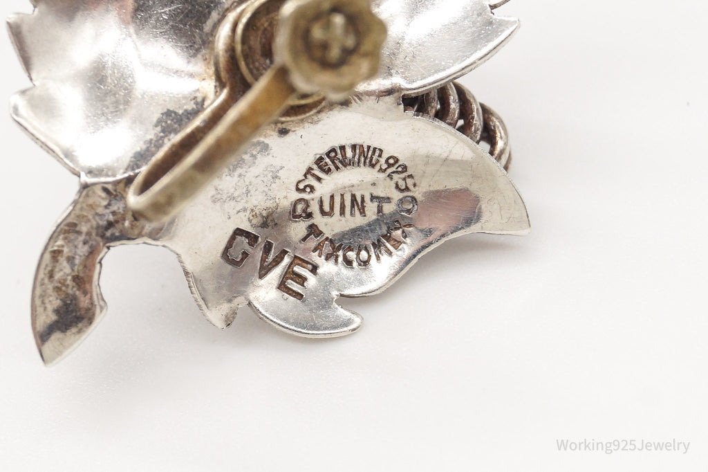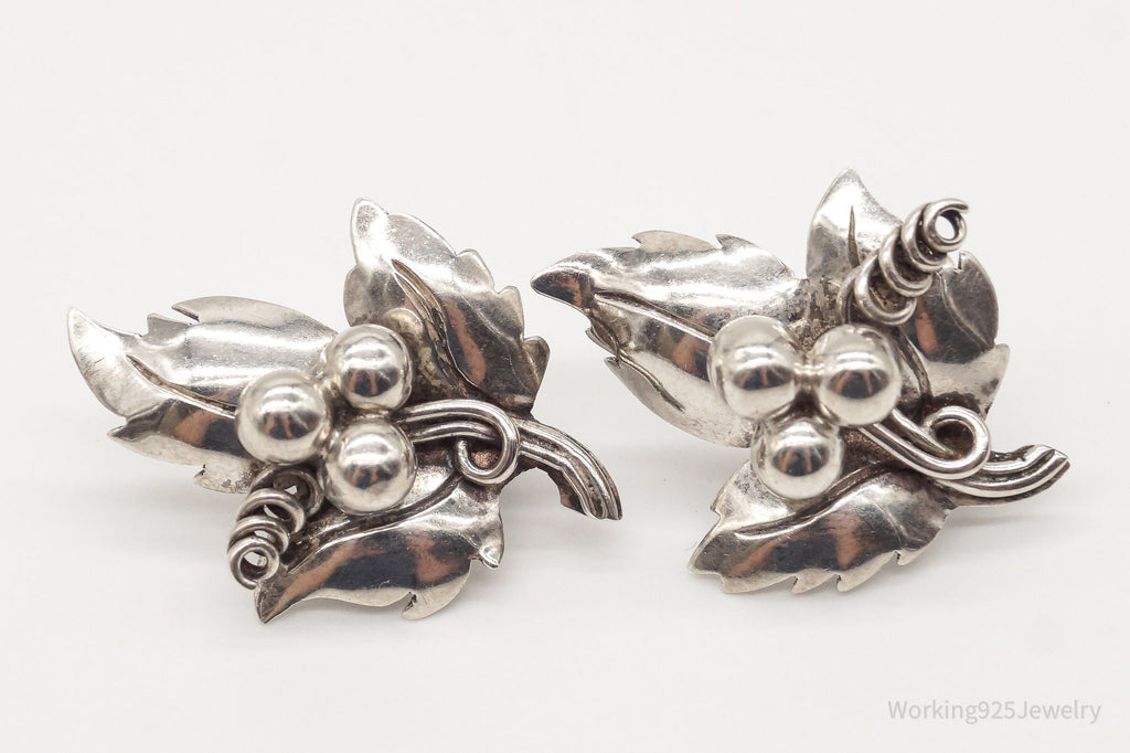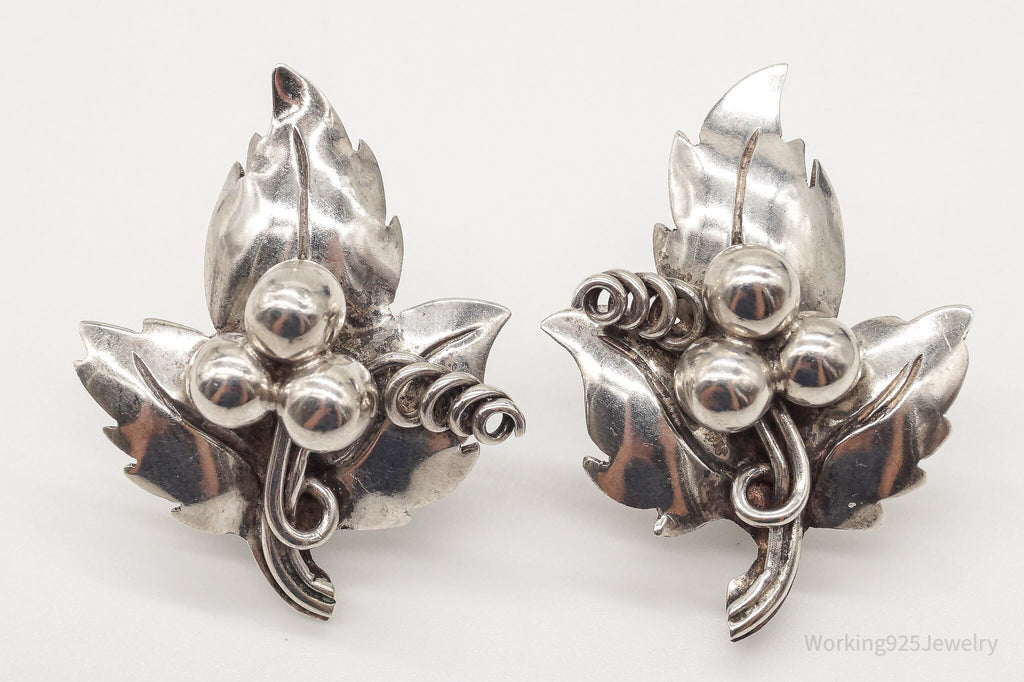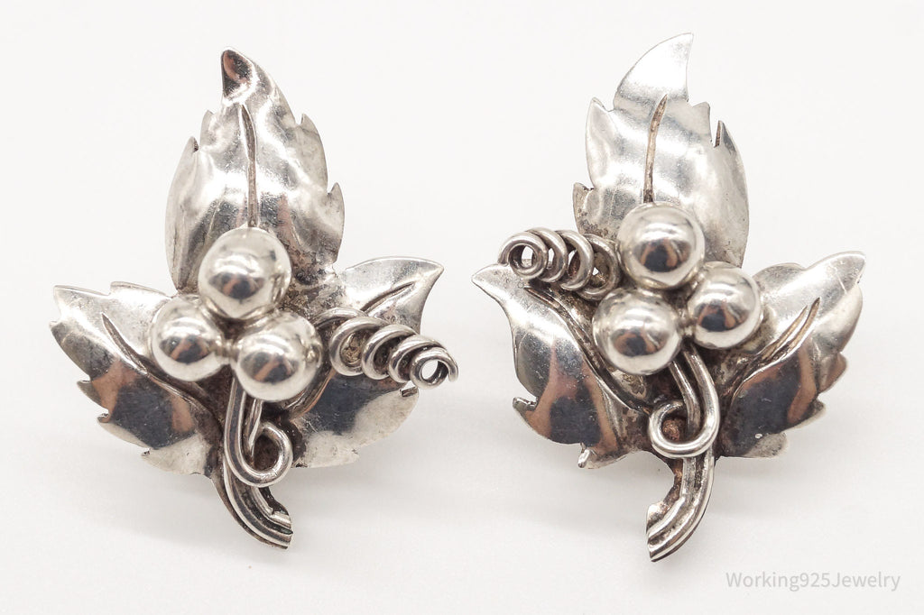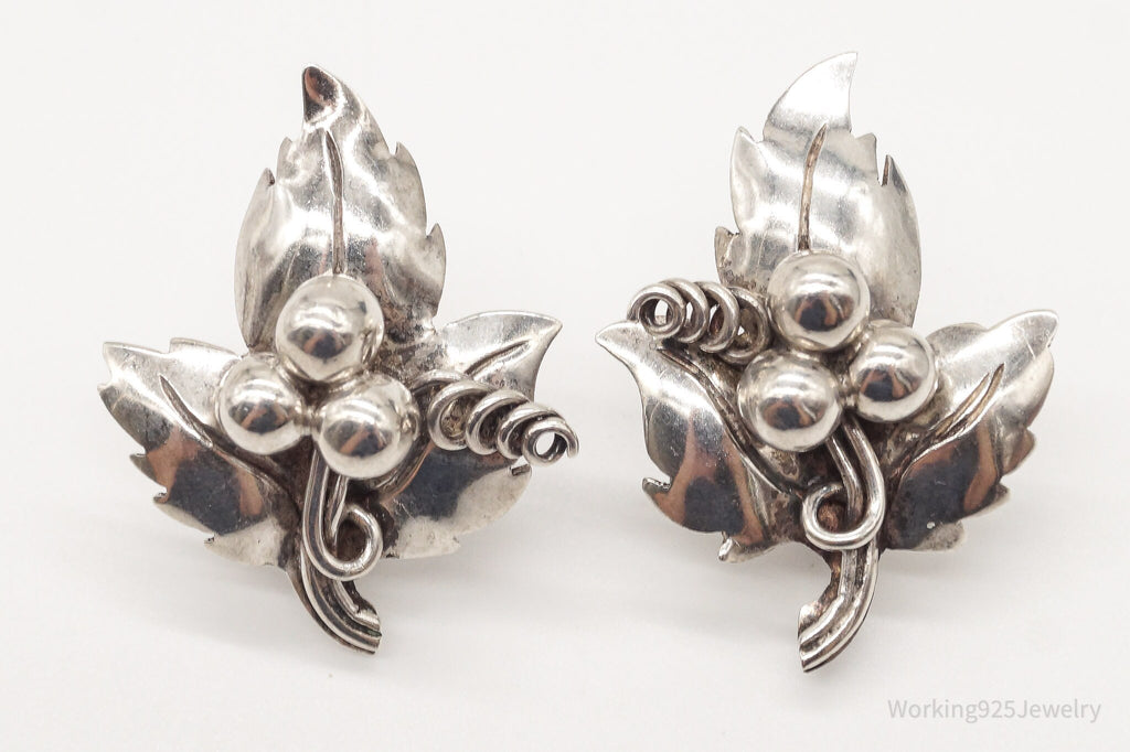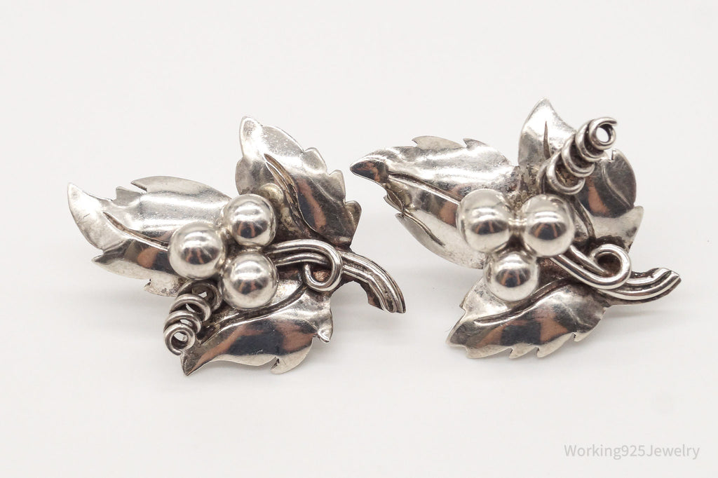 Rare Vintage Mexico Artisan Quinto Leaves Sterling Silver Screw Back Earrings