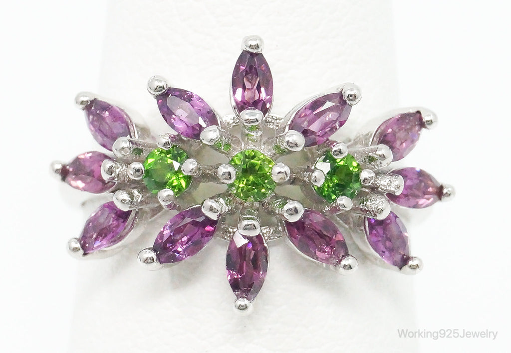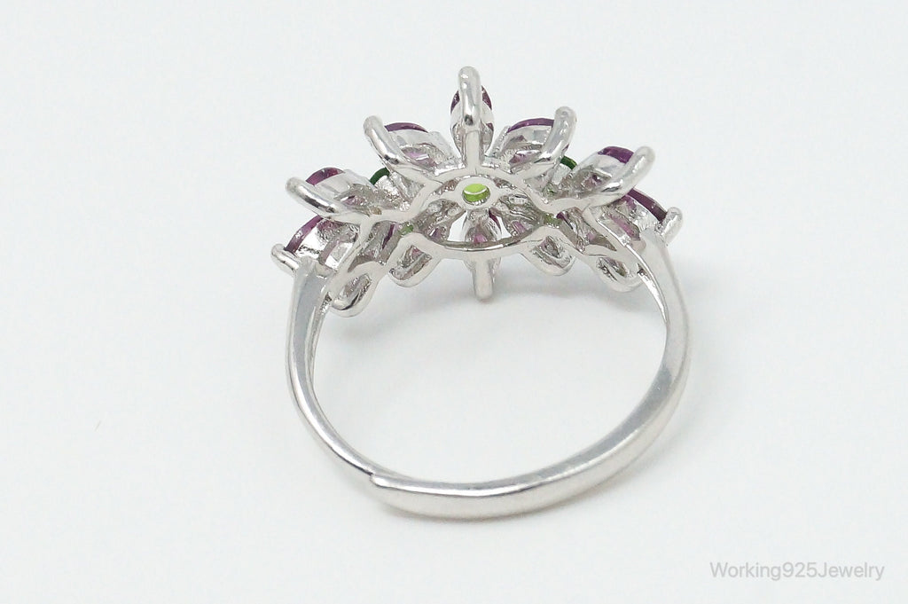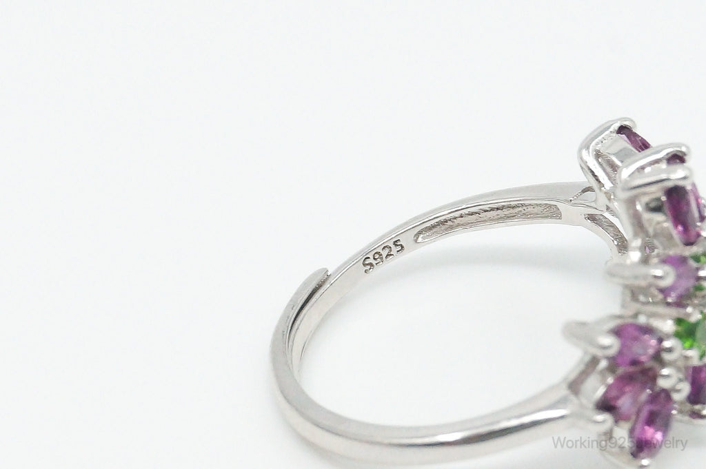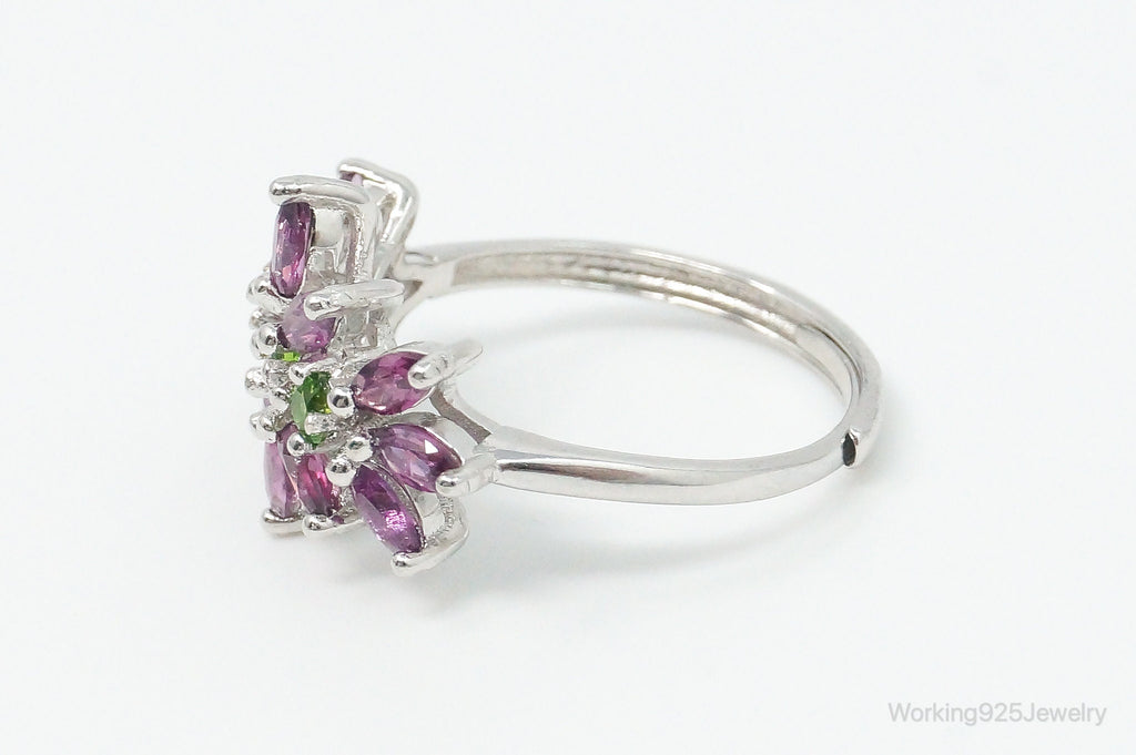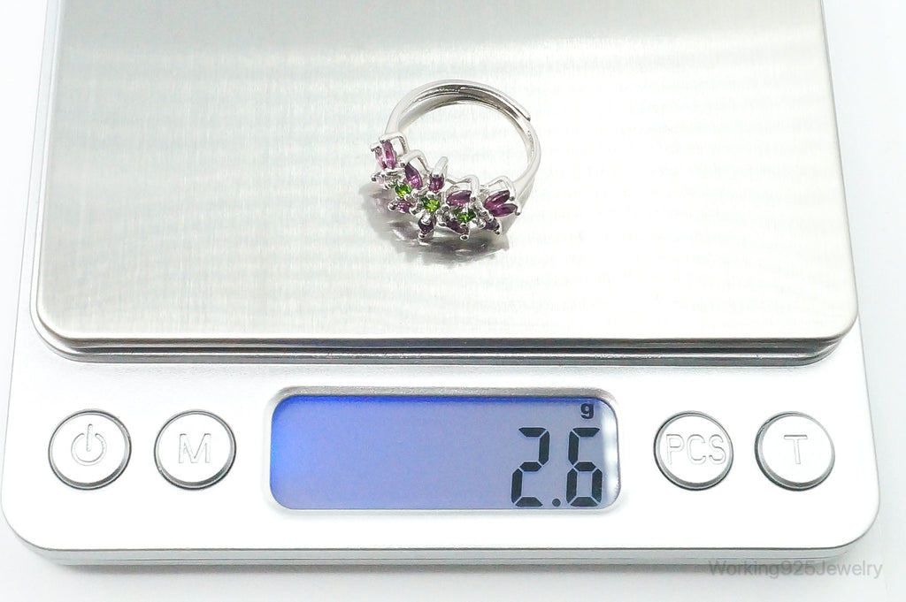 Rhodolite Garnet Green Cubic Zirconia Sterling Silver Ring - Size 6.5 Adjustable
