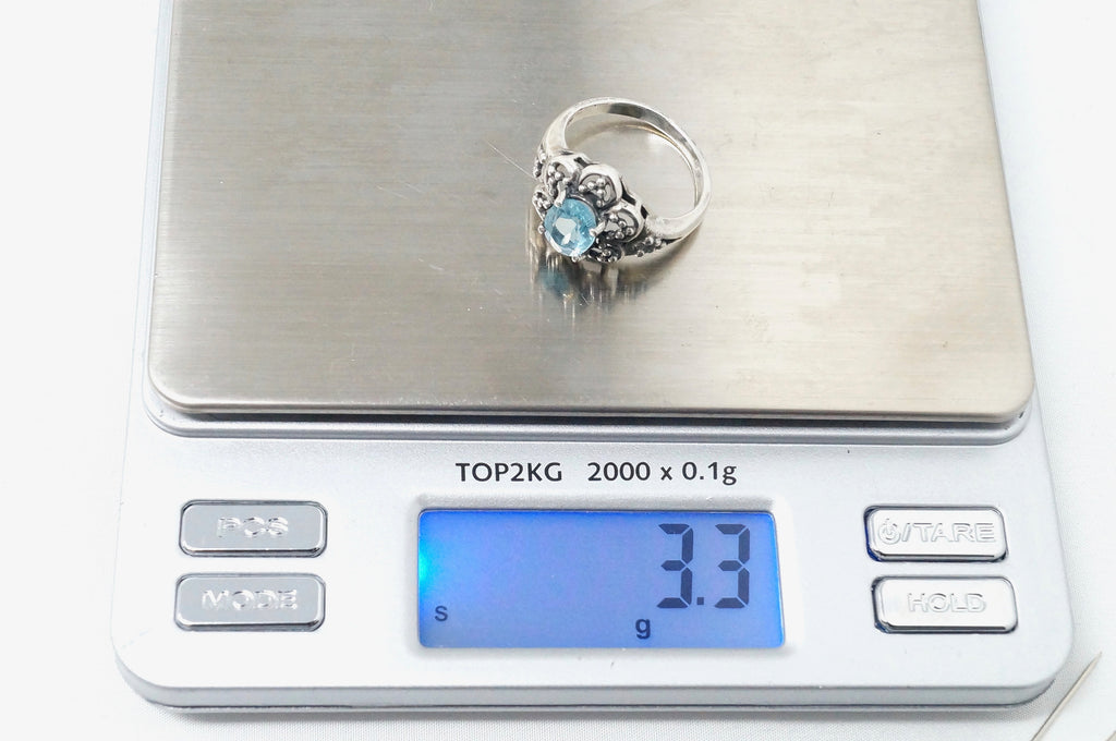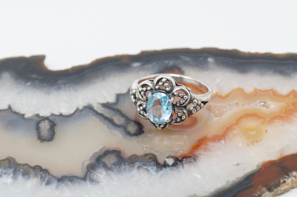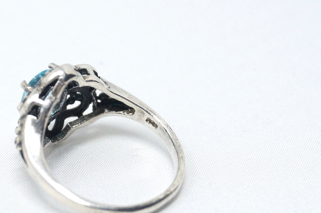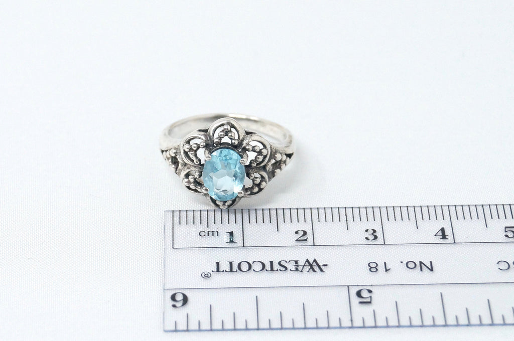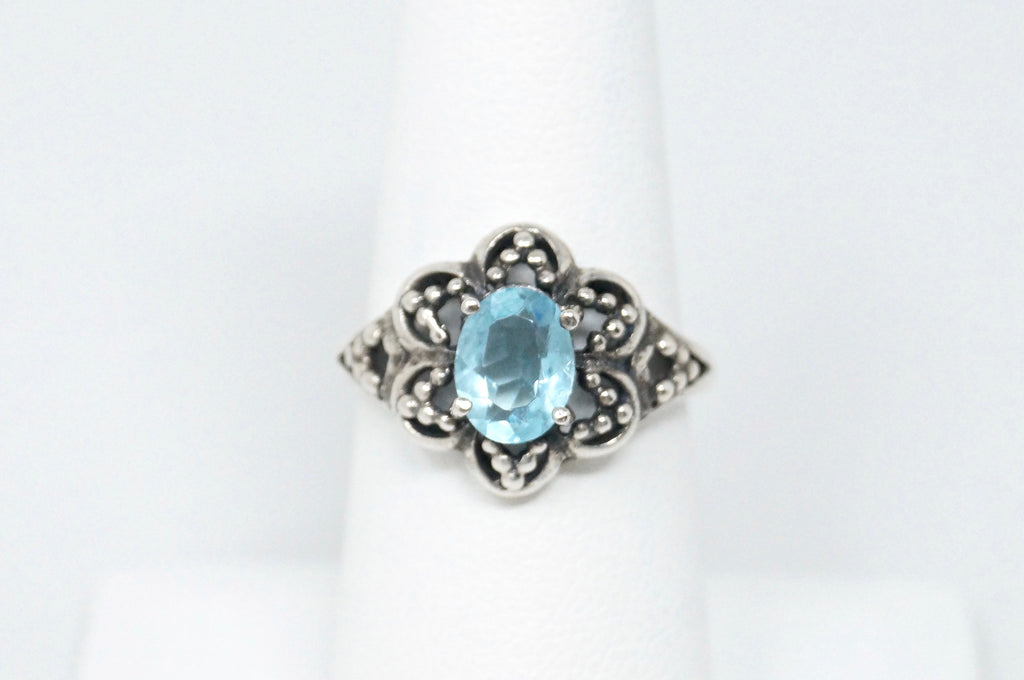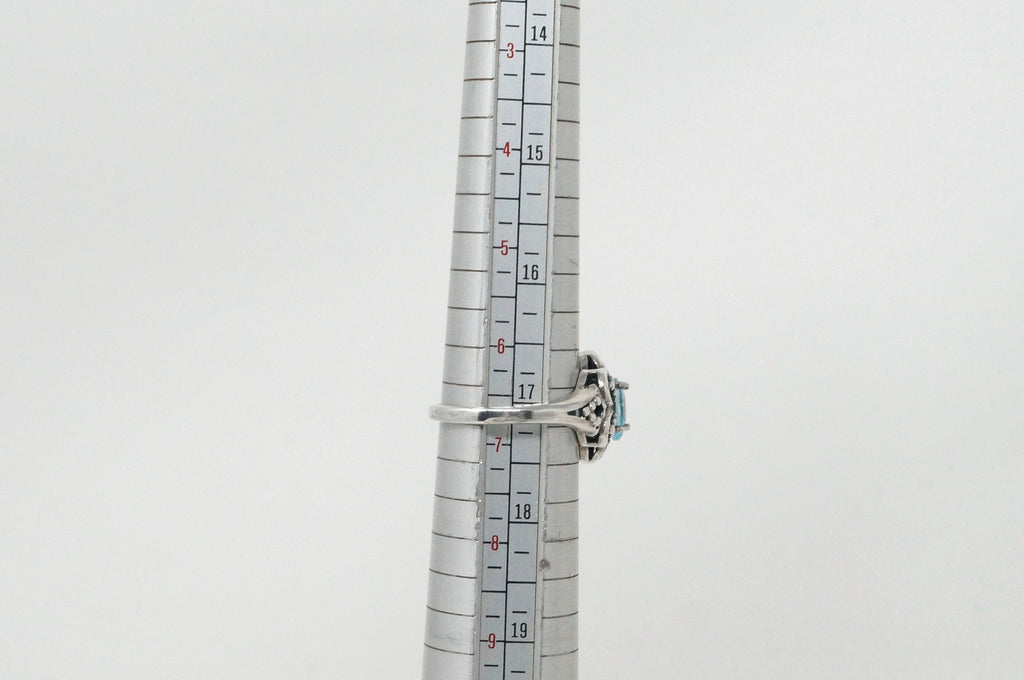 Vintage Art Deco Blue Topaz Flower Burst Cut Out Sterling Silver Ring Size 6.25