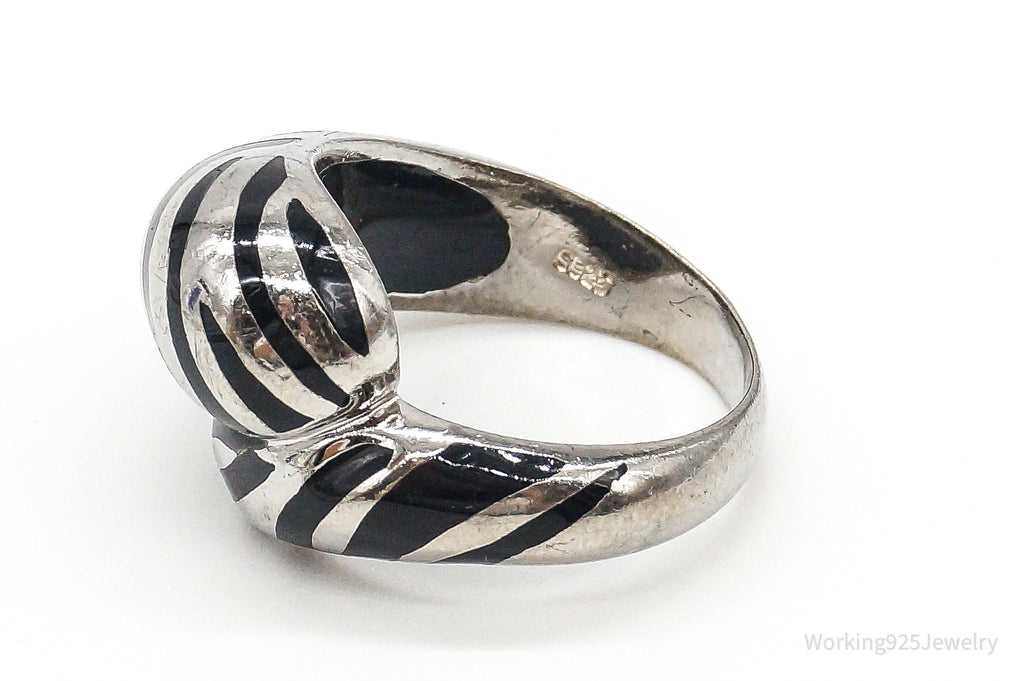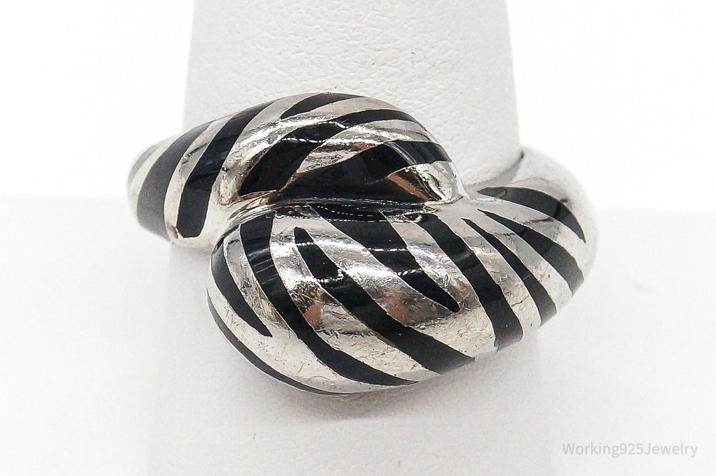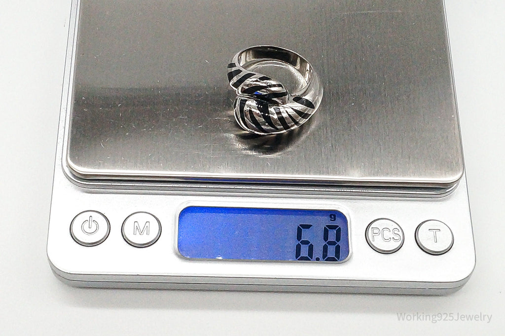 Vintage Black Enamel Zebra Stripes Design Sterling Silver Ring - Size 9