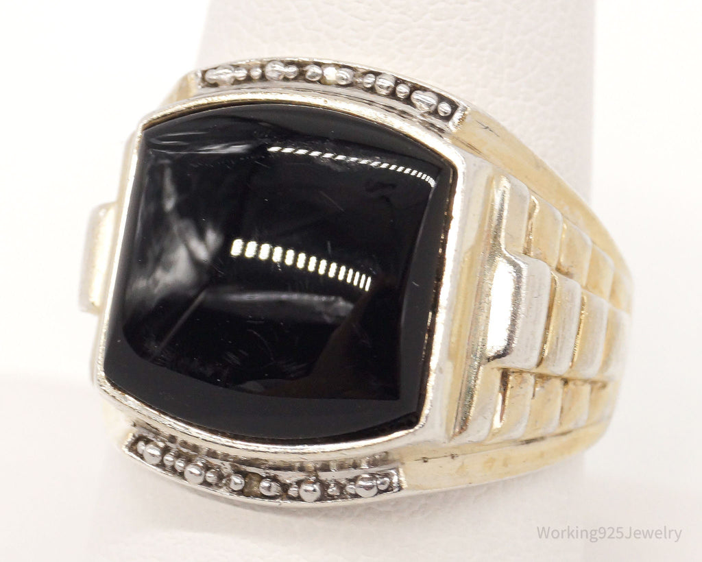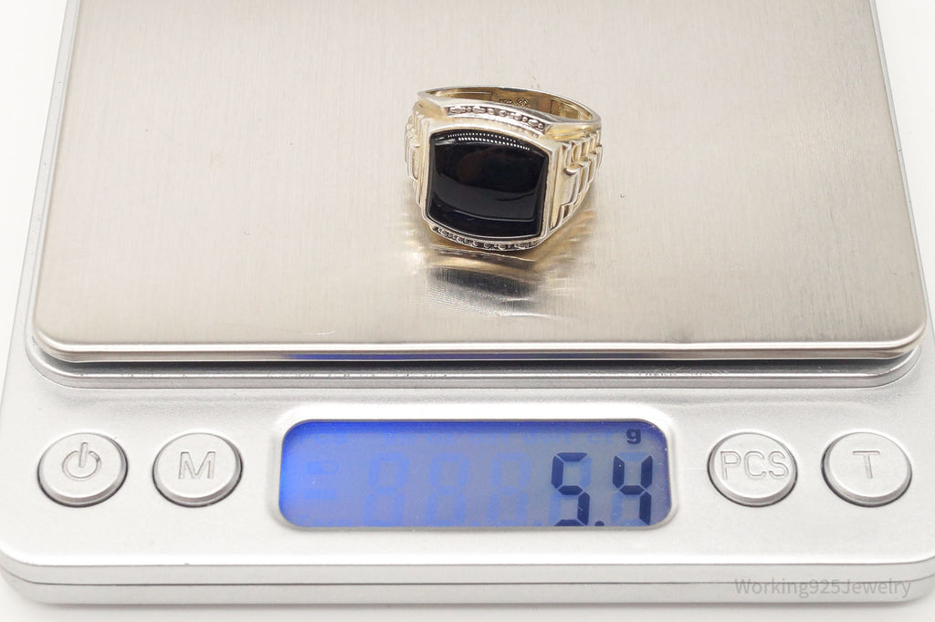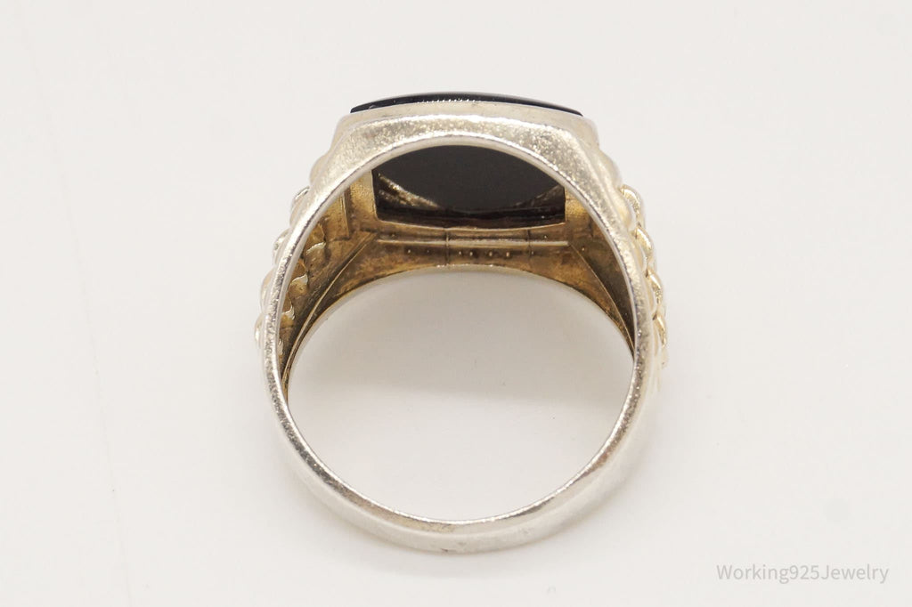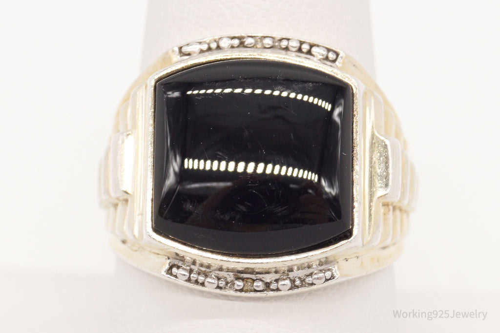 Vintage Black Onyx Two Diamond Gold Wash Sterling Silver Ring - Size 8.75