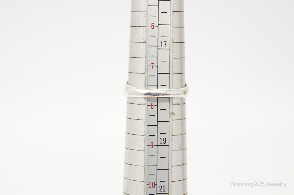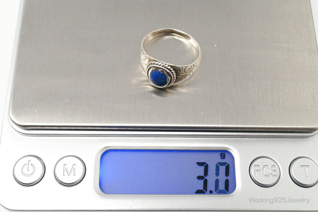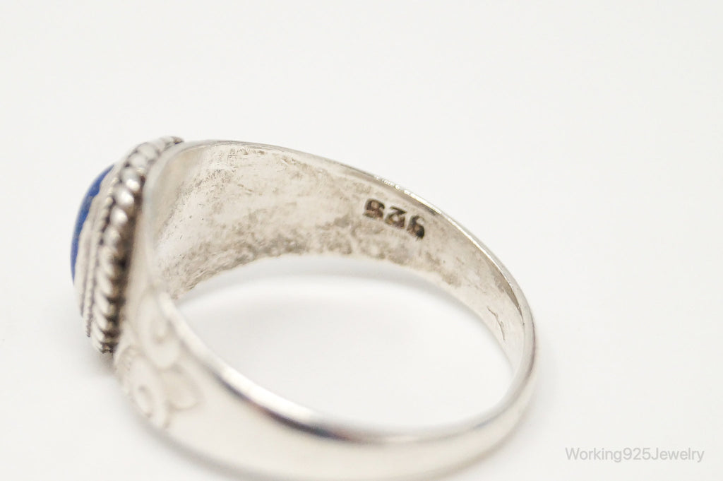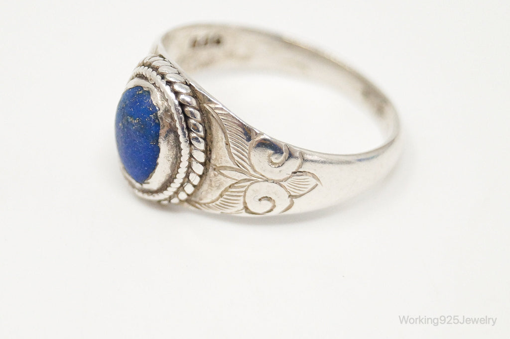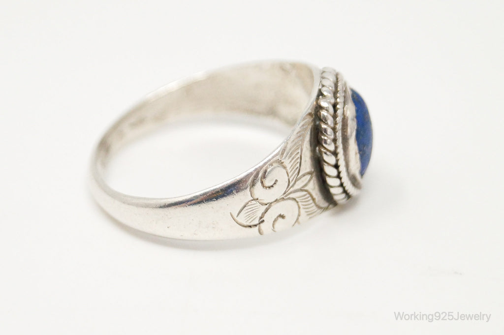 Vintage Blue Lapis Lazuli Art Nouveau Etched Sterling Silver Ring - Size 7.75