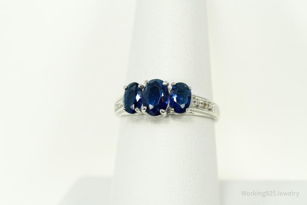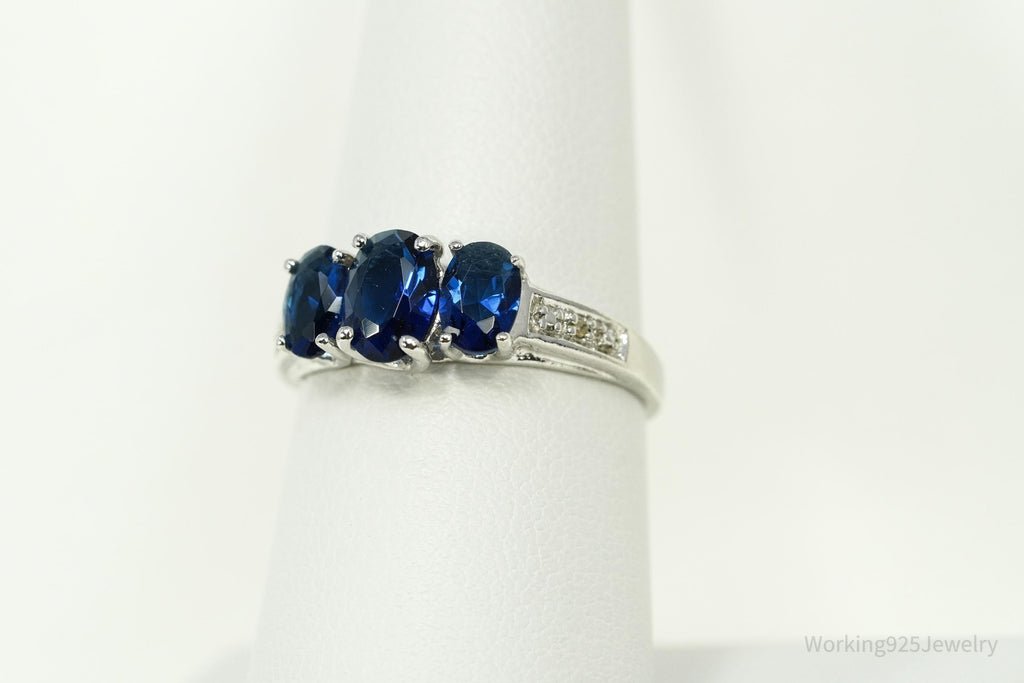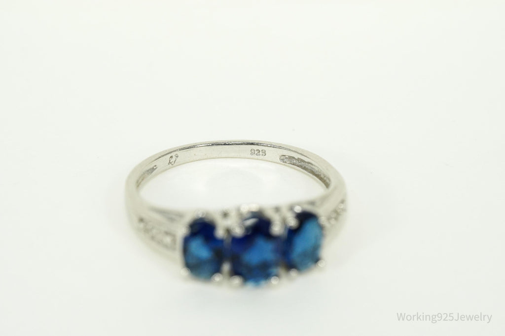 Vintage Blue Simulated Sapphires & 2 Diamonds Sterling Silver Ring - Size 7.25