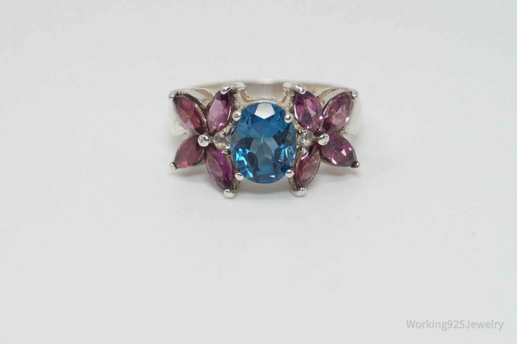 Vintage Blue Topaz Amethyst CZ Floral Sterling Silver Ring - Sz 9.5