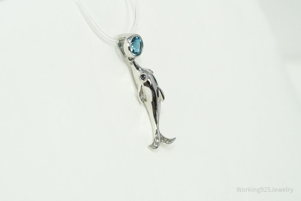 Vintage Blue Topaz Dolphin Sterling Silver Necklace Pendant 1 1/8"