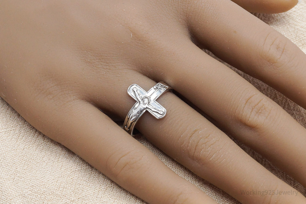 Vintage Crucifix Cross Sterling Silver Band Ring - Size 8.75 Adjustable