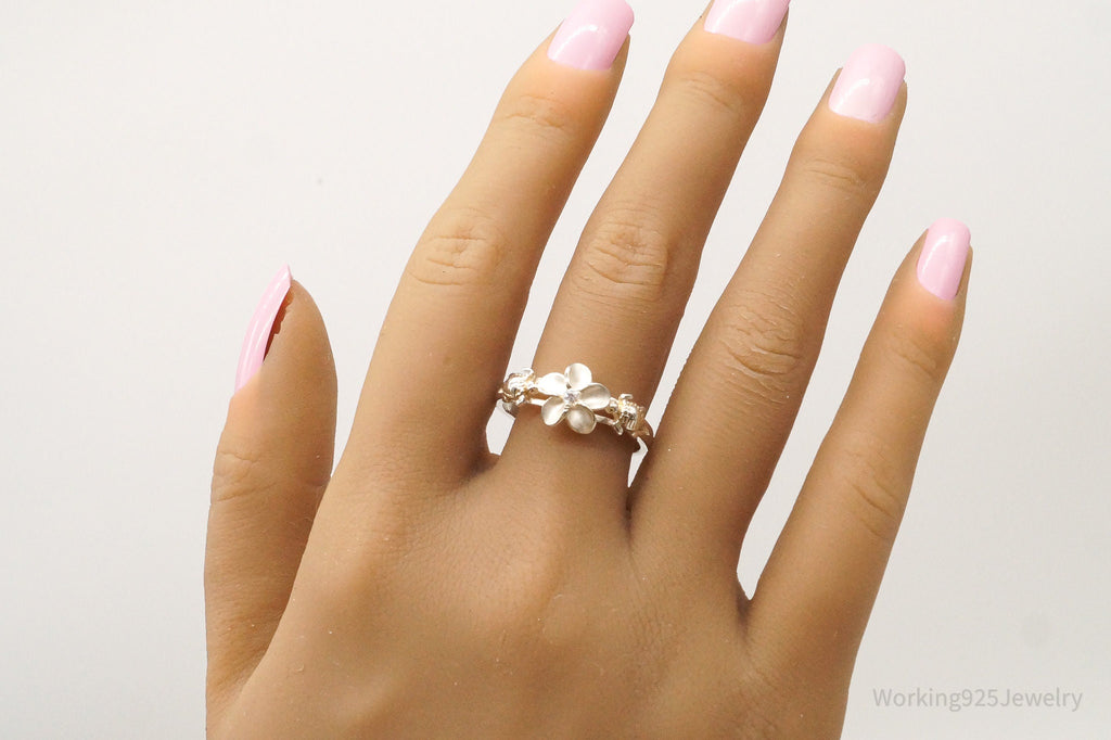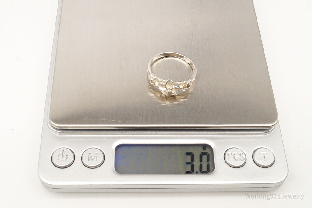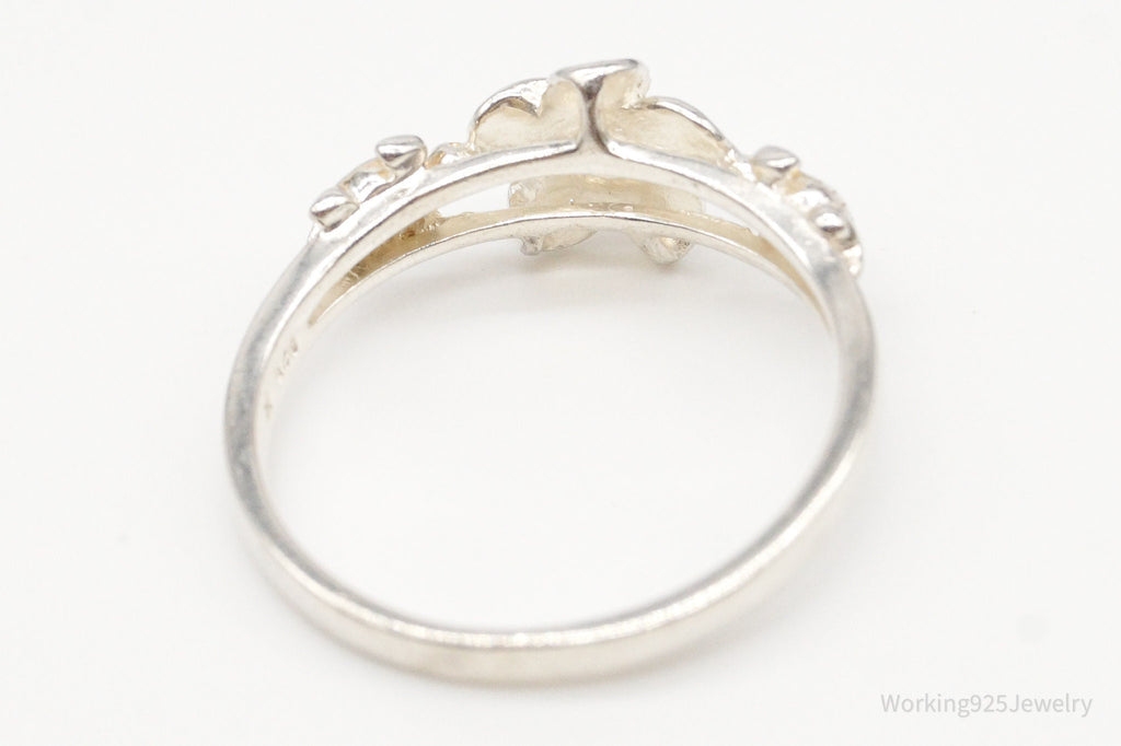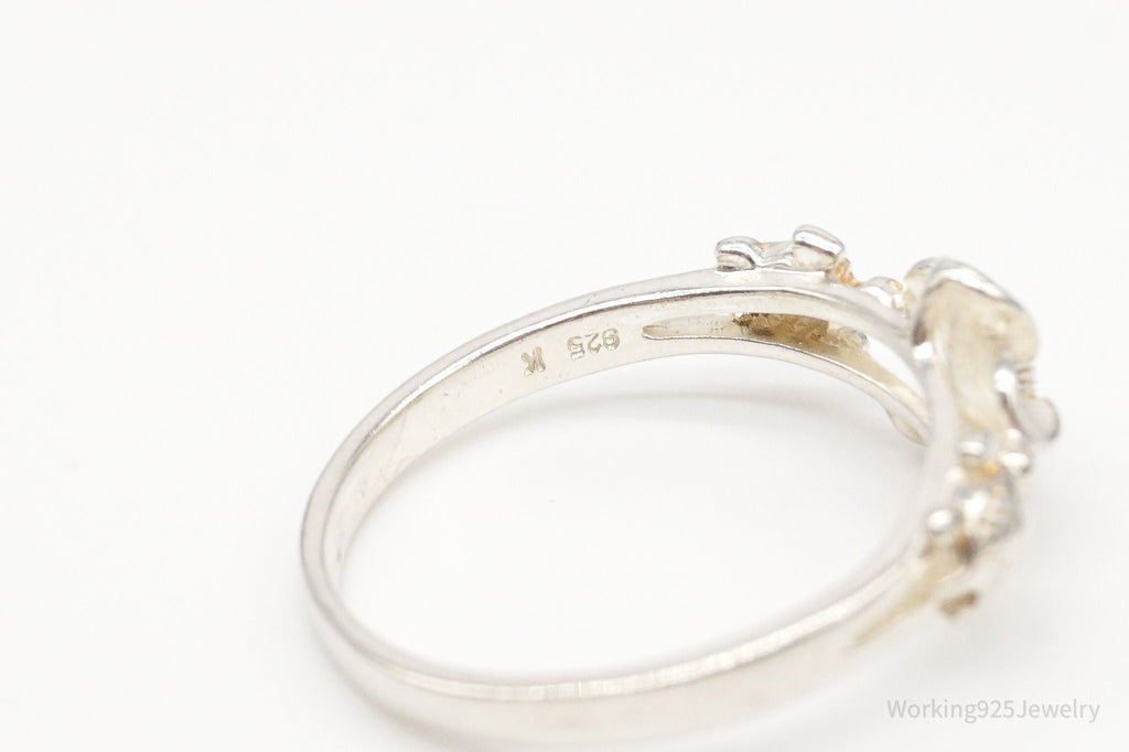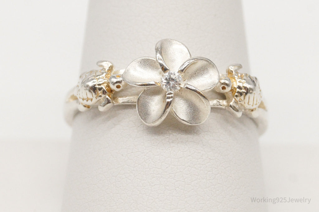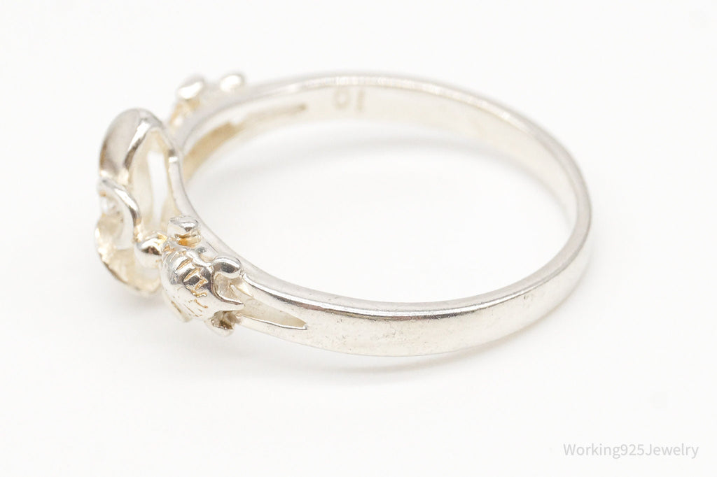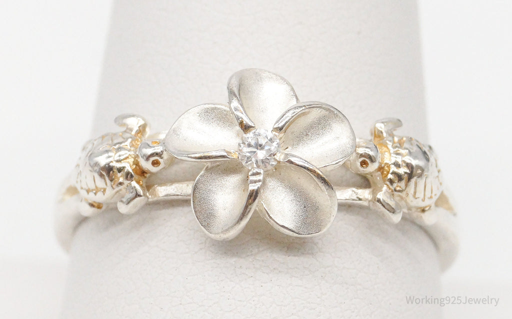 Vintage Cubic Zirconia Flower Turtles Sterling Silver Ring - Size 10
