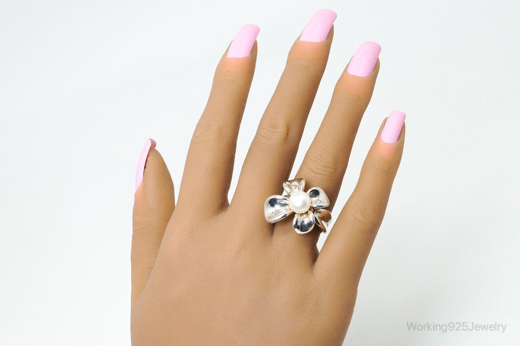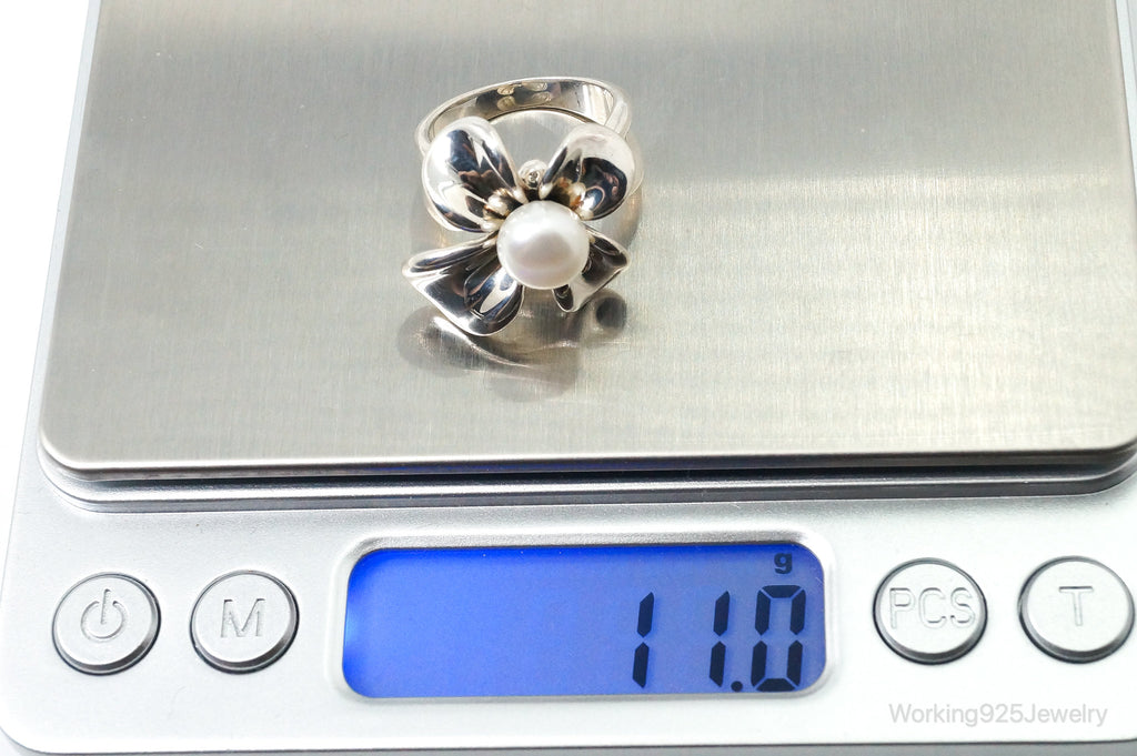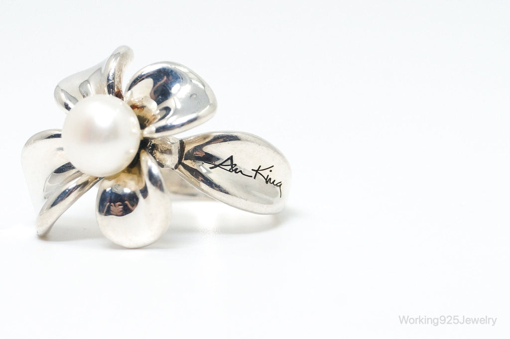 Vintage Designer Ann King Flower Pearl Sterling Silver Ring Size 6