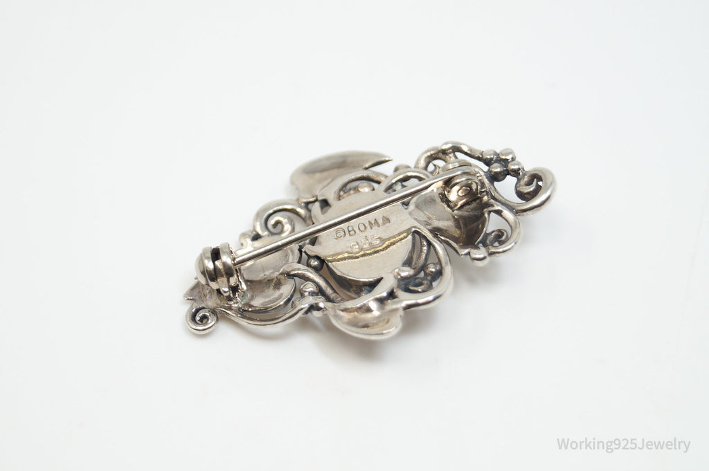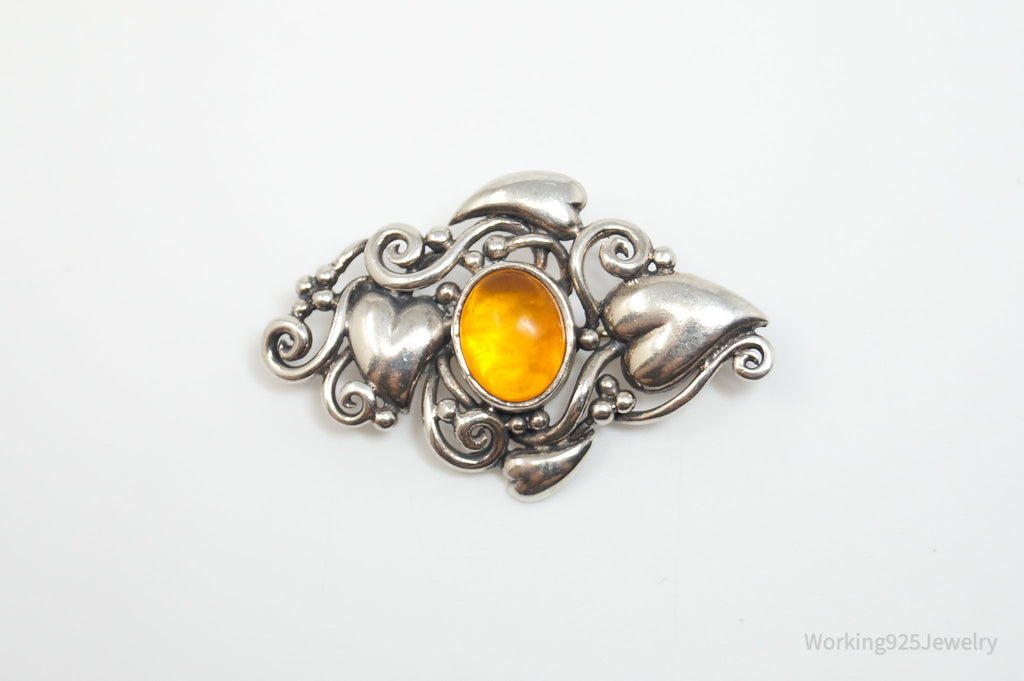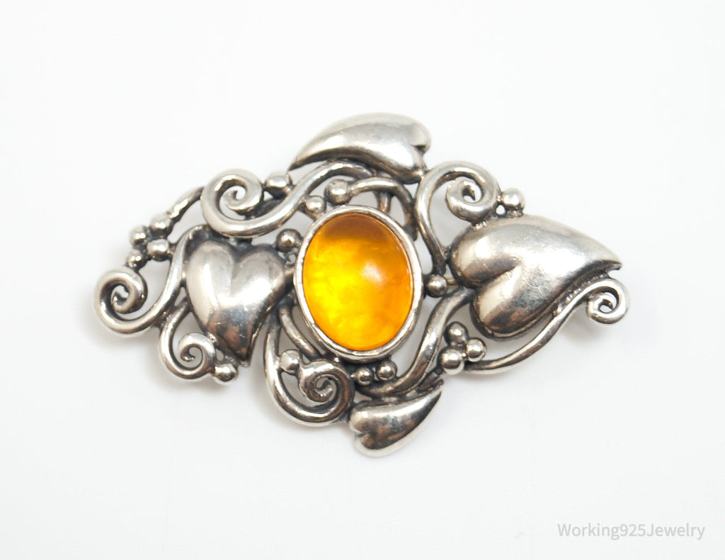 Vintage Designer BOMA Amber Heart Sterling Silver Brooch Pin