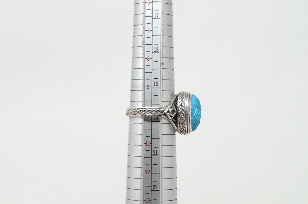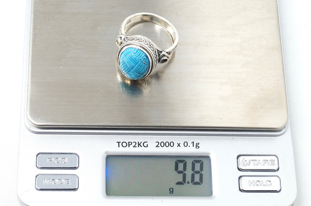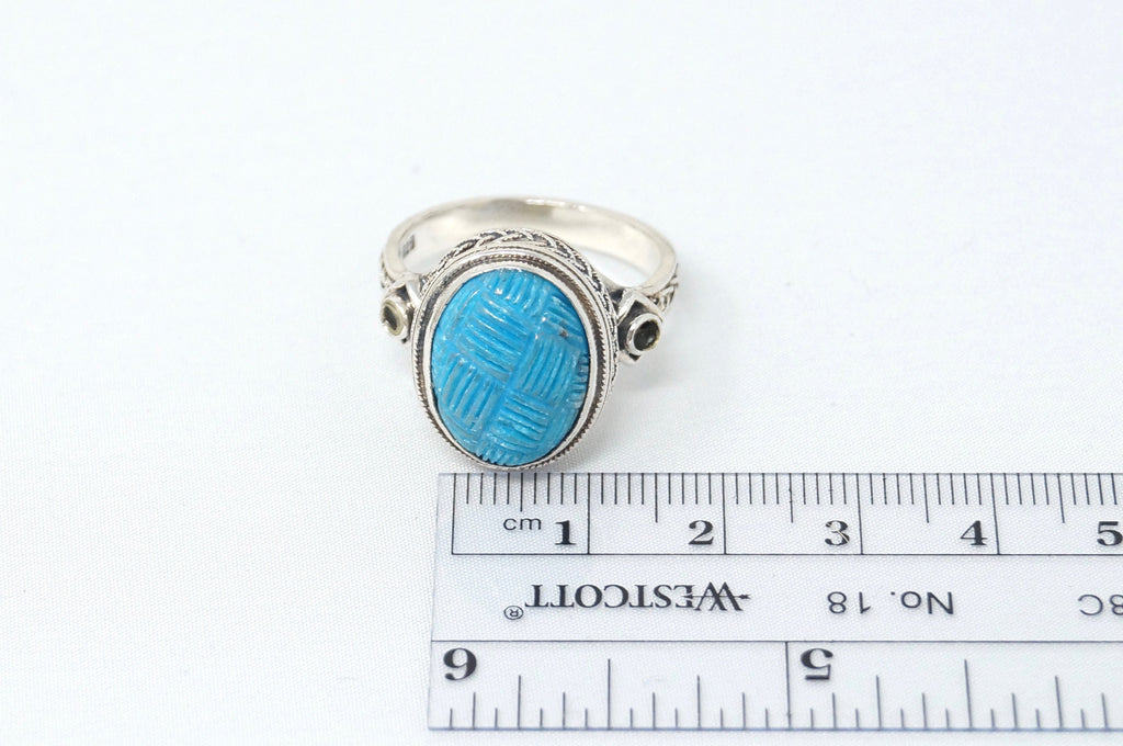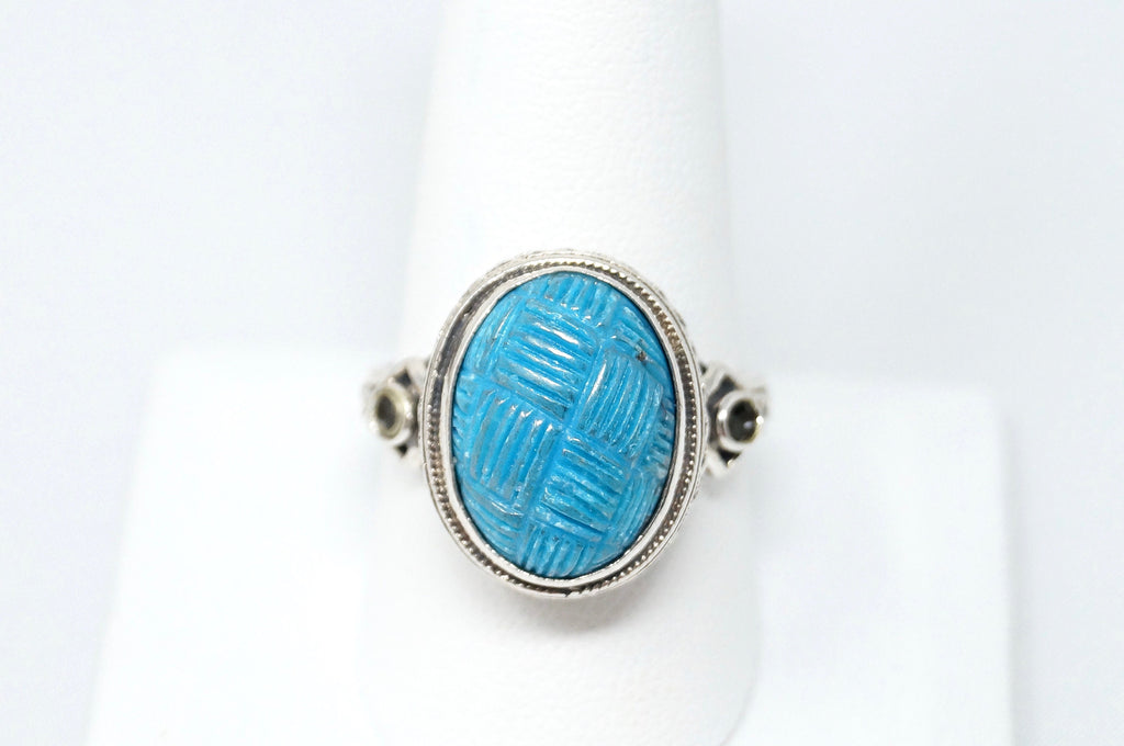 Vintage Designer Carved Turquoise Sterling Silver Ring - Size 10