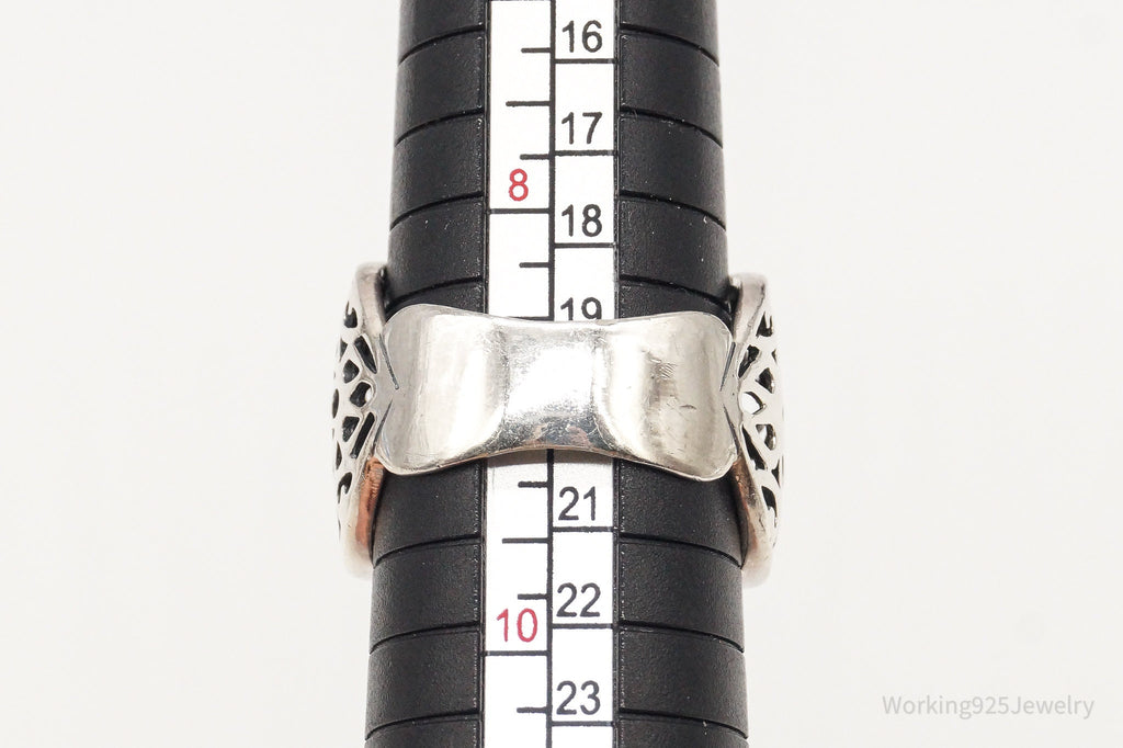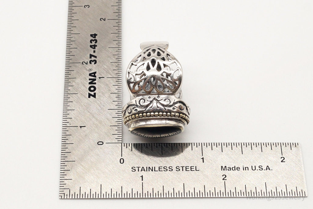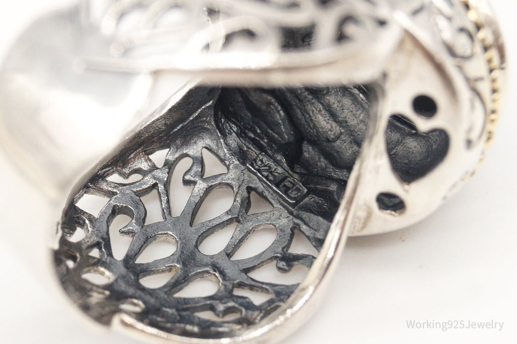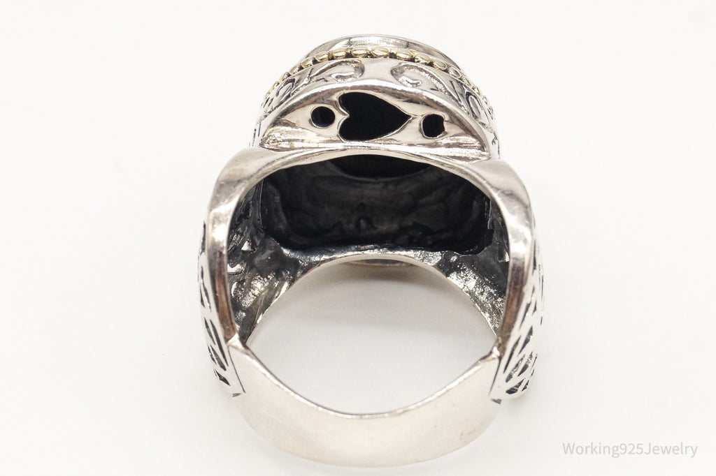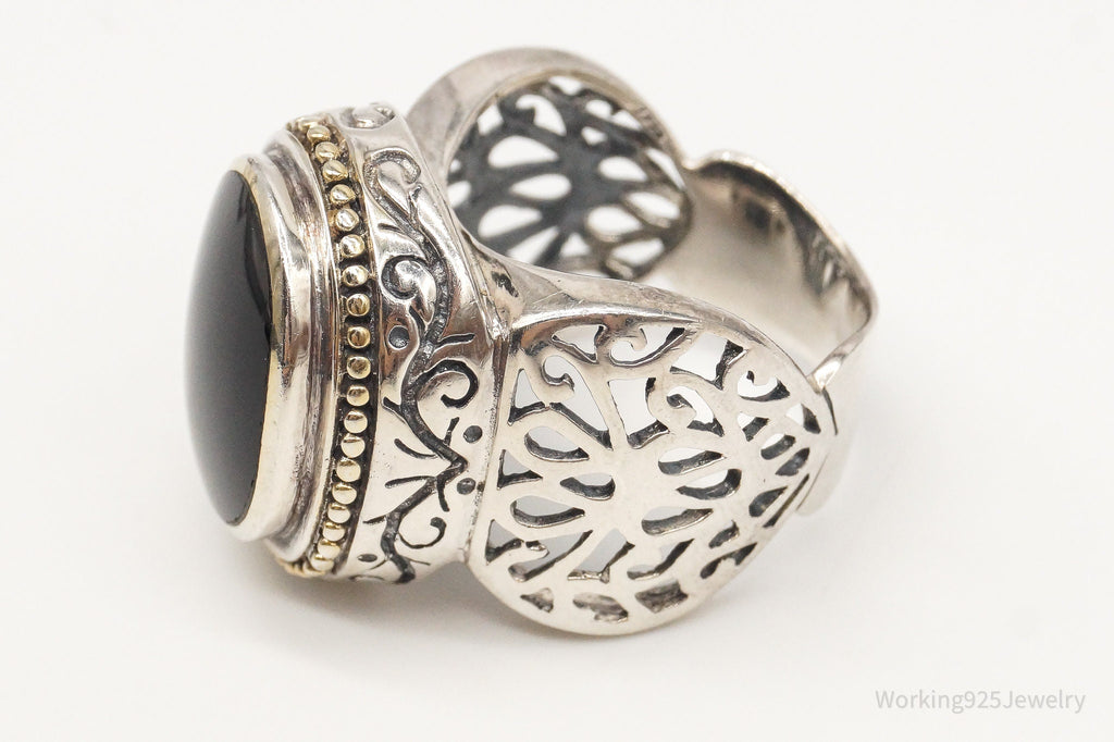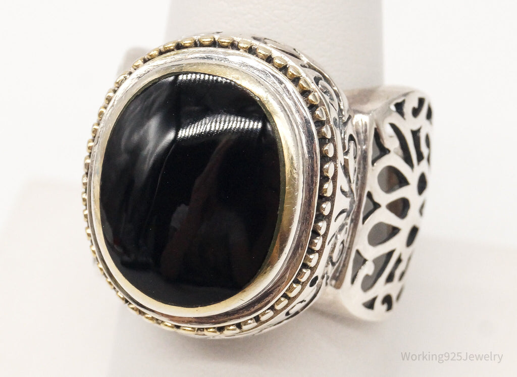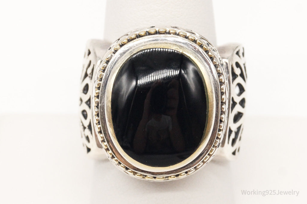 Vintage Designer FD Large Black Onyx Brass Sterling Silver Ring - Size 9