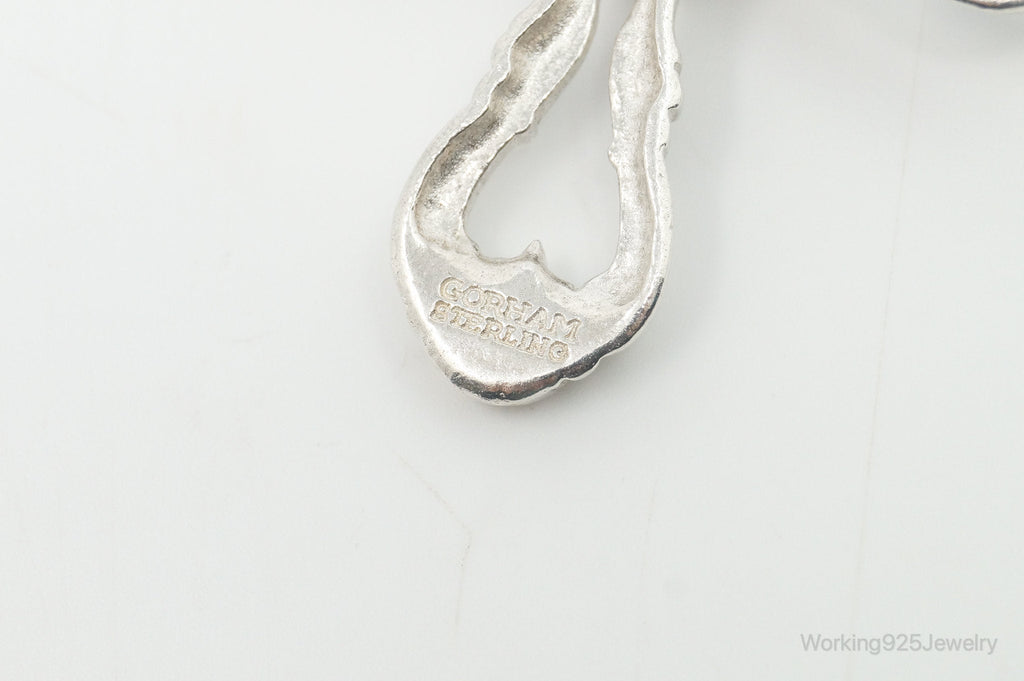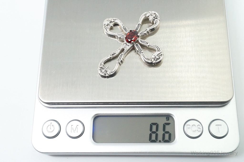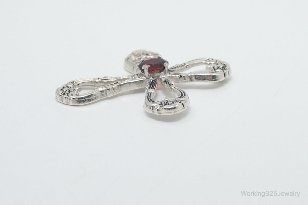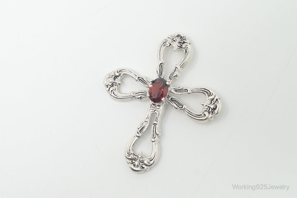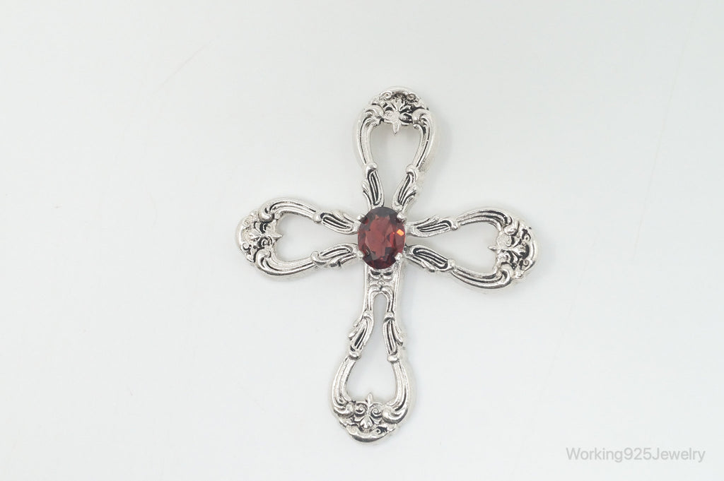 Vintage Designer Gorham Garnet Ornate Sterling Silver Cross Necklace Pendant