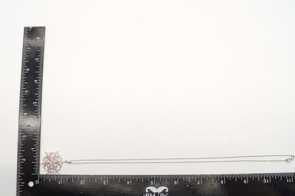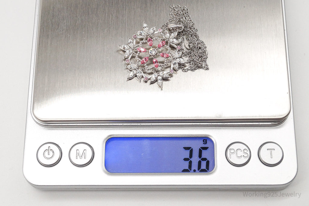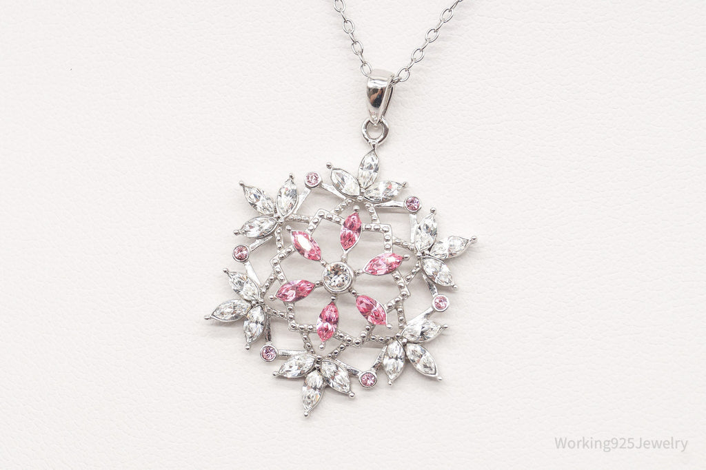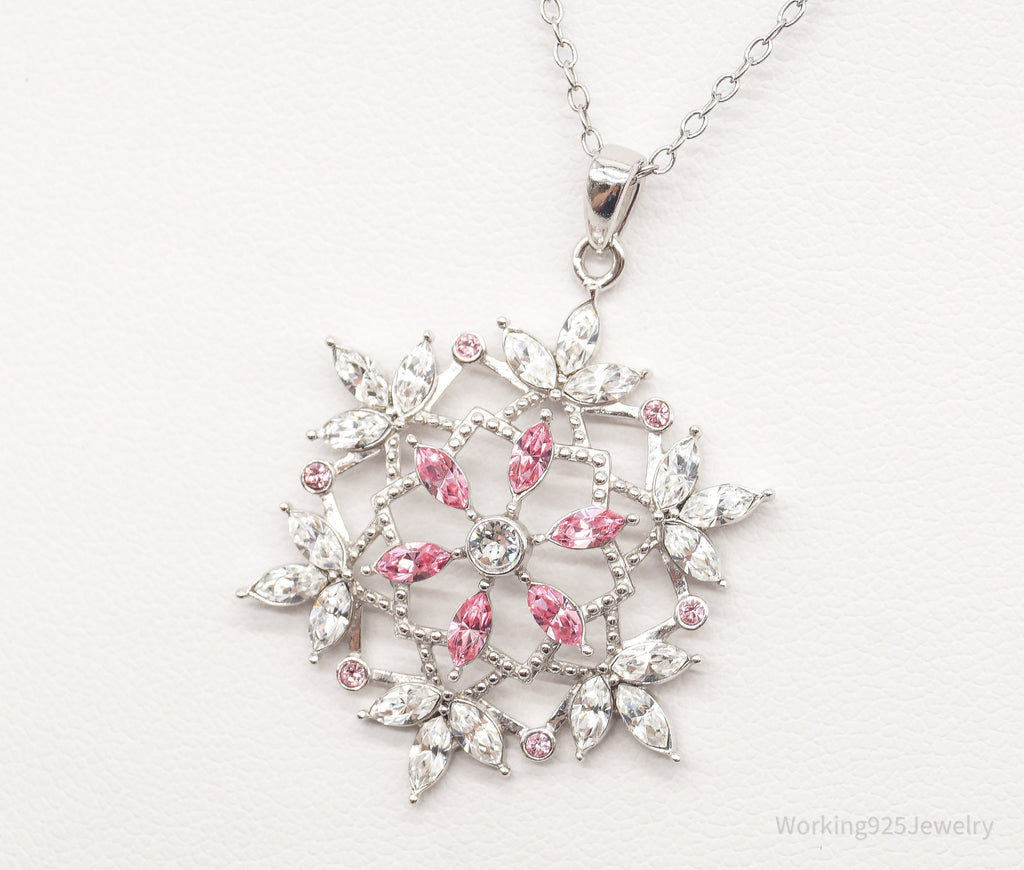 Vintage Designer RL Pink & White Crystal Snowflake Sterling Silver Necklace