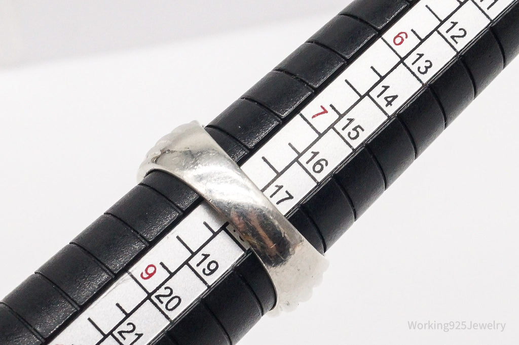 Ring Listings: It is sometimes difficult to determine how a ring will fit without being able to try it on. I always recommend taking your favorite ring to a local jeweler and comparing the way that it sits on a mandrel (ring sizer) with the pictures in the listings prior to purchase. Sometimes wide band rings fit a little differently and I always want my customers to be 100% happy with their purchases! Please let me know if I can help by offering more pictures for size comparison.