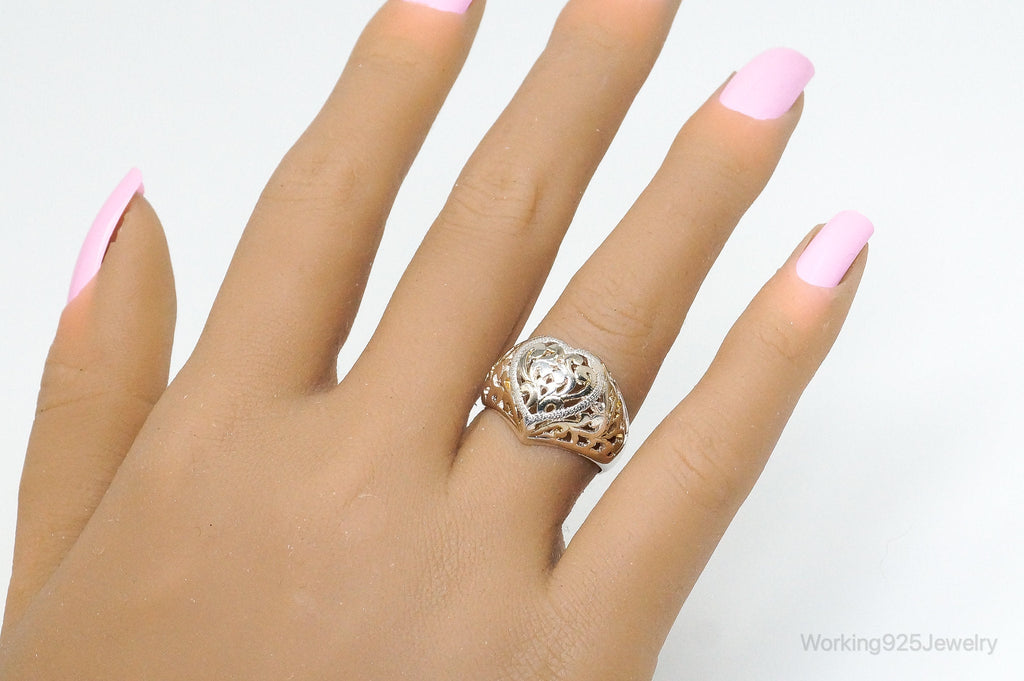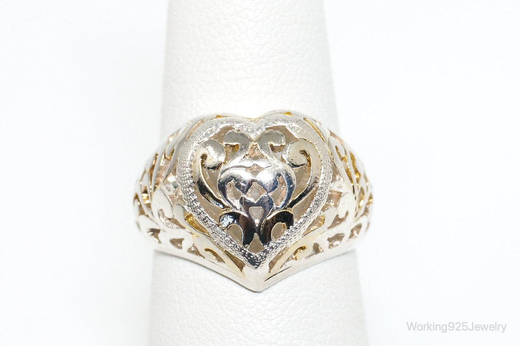 Vintage Designer SU Motif Cut Out Heart Gold Wash Sterling Silver Ring - SZ 7