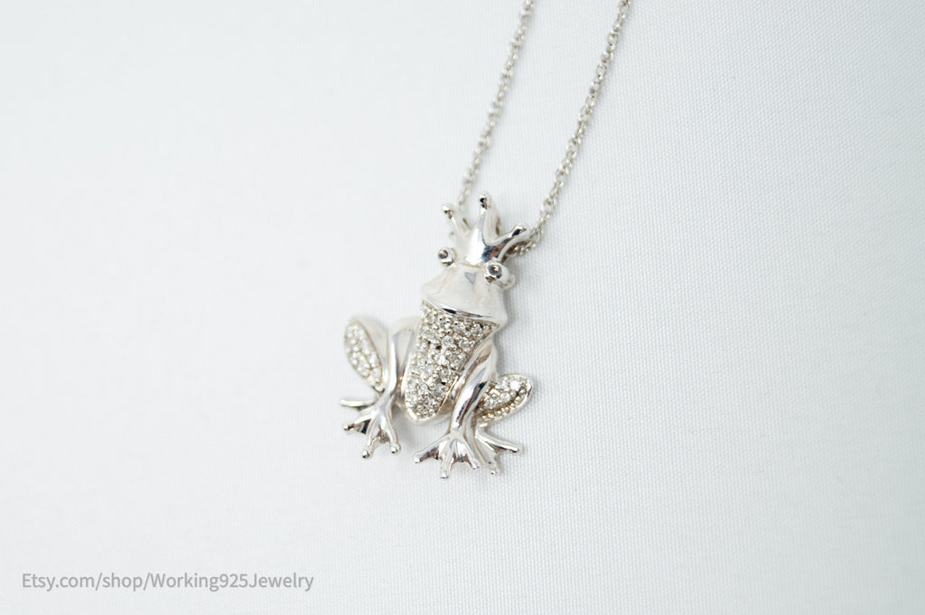 Vintage Diamond King Frog Toad Sterling Silver Necklace