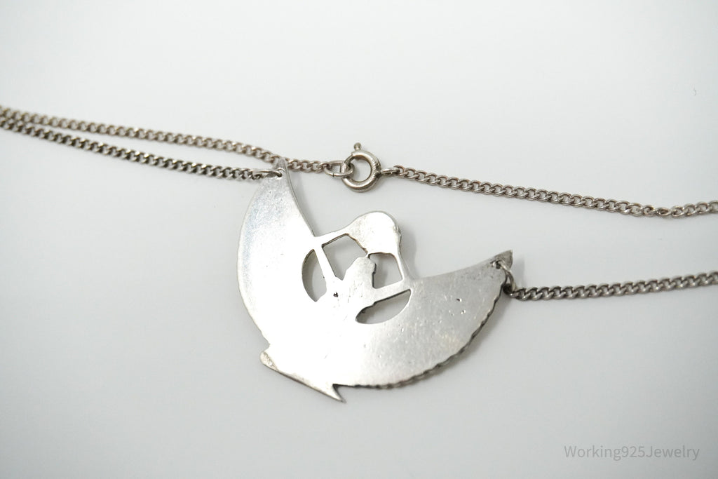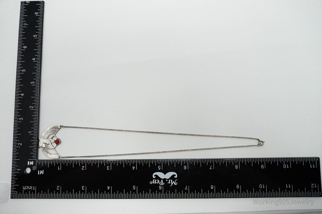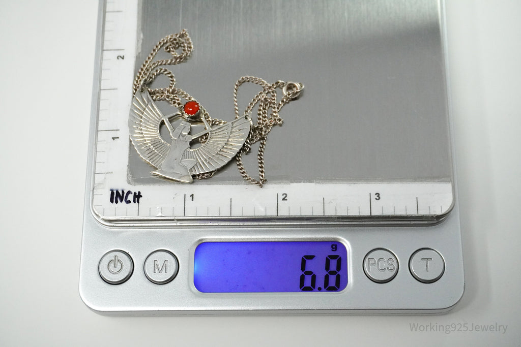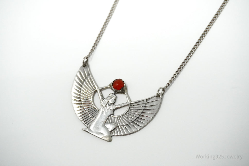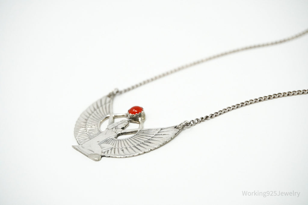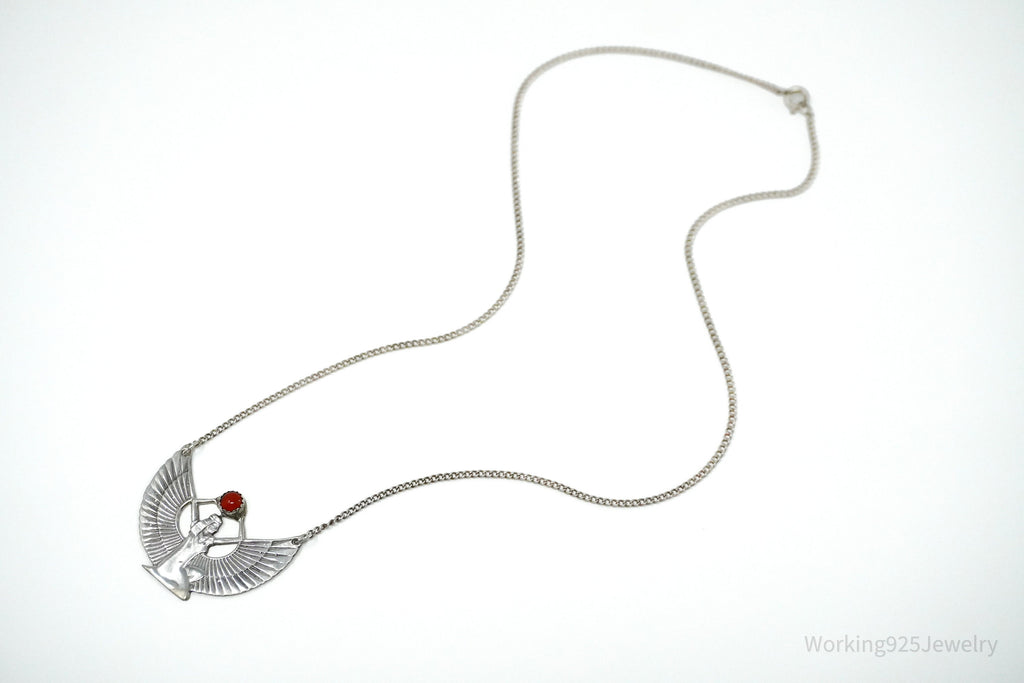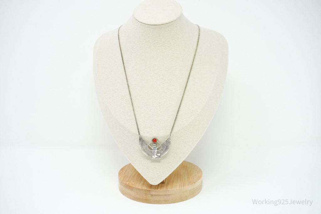 Vintage Egyptian Winged Goddess Isis Red Stone Sterling Silver Necklace 16"