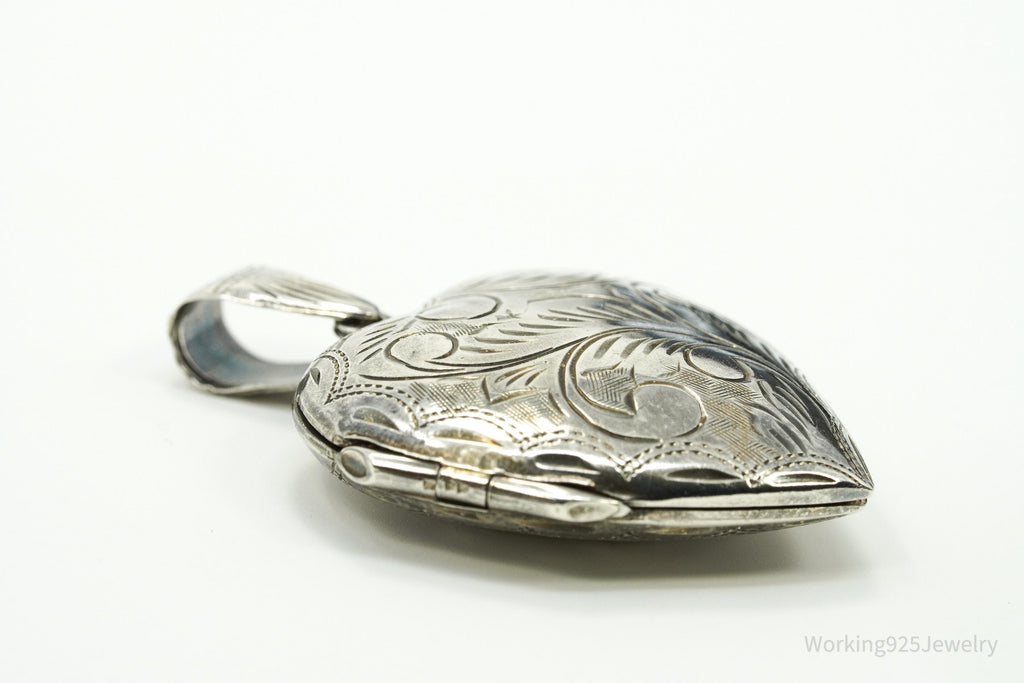 Vintage Etched Floral Heart Picture Locket Sterling Silver Pendant