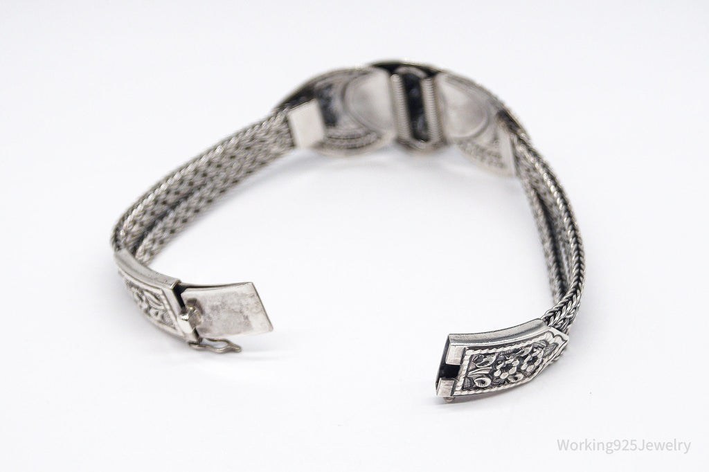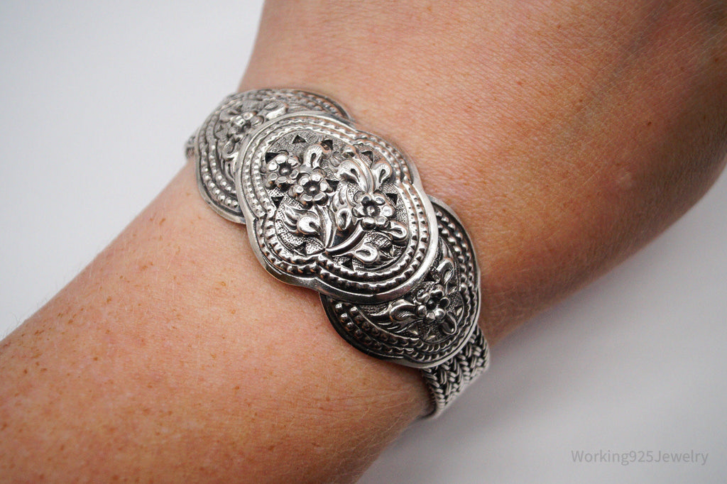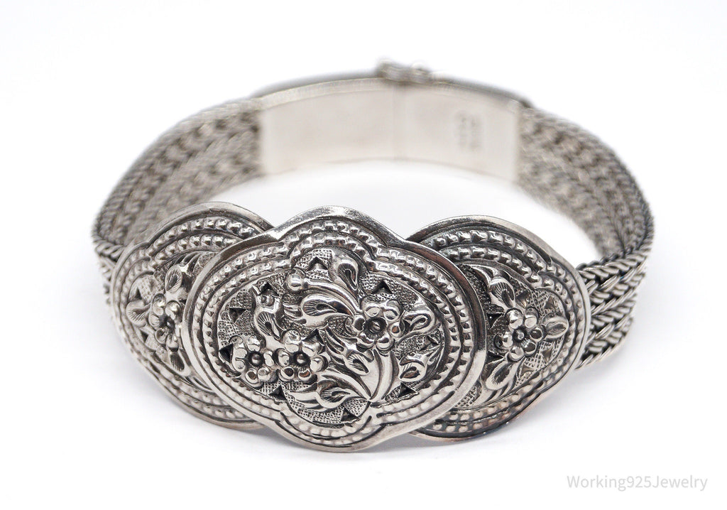 Vintage Floral Pattern Repousse Sterling Silver Bracelet 7 1/8"