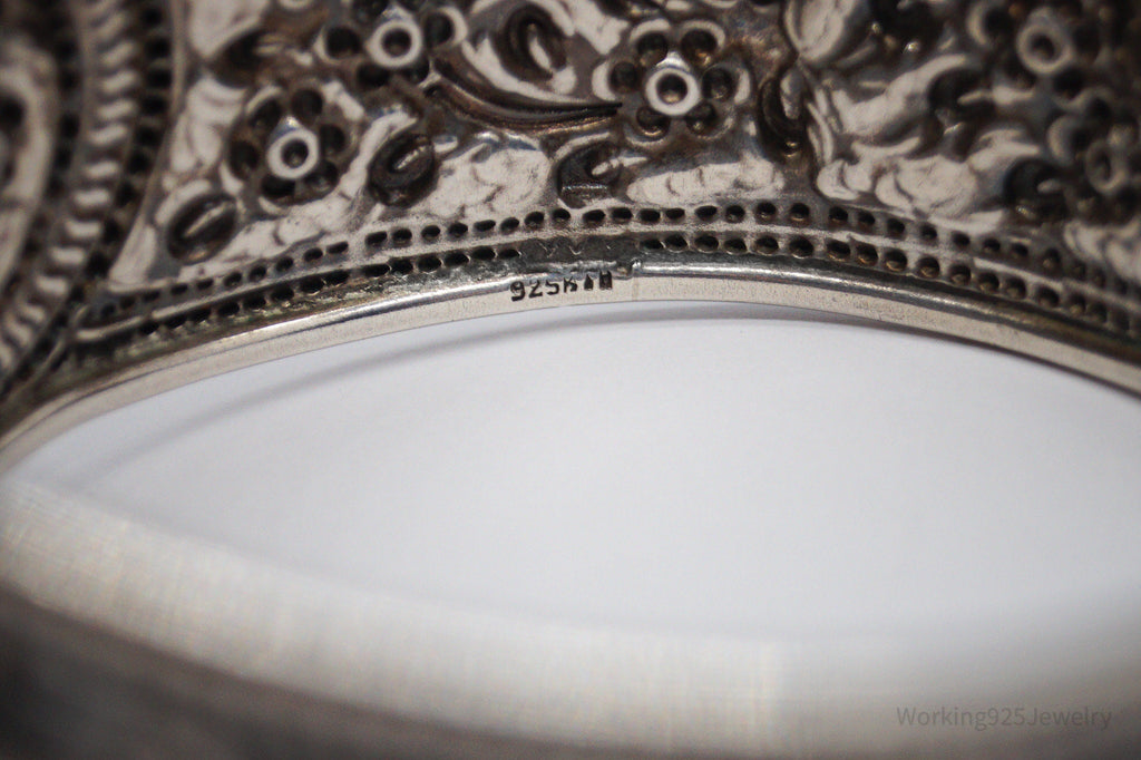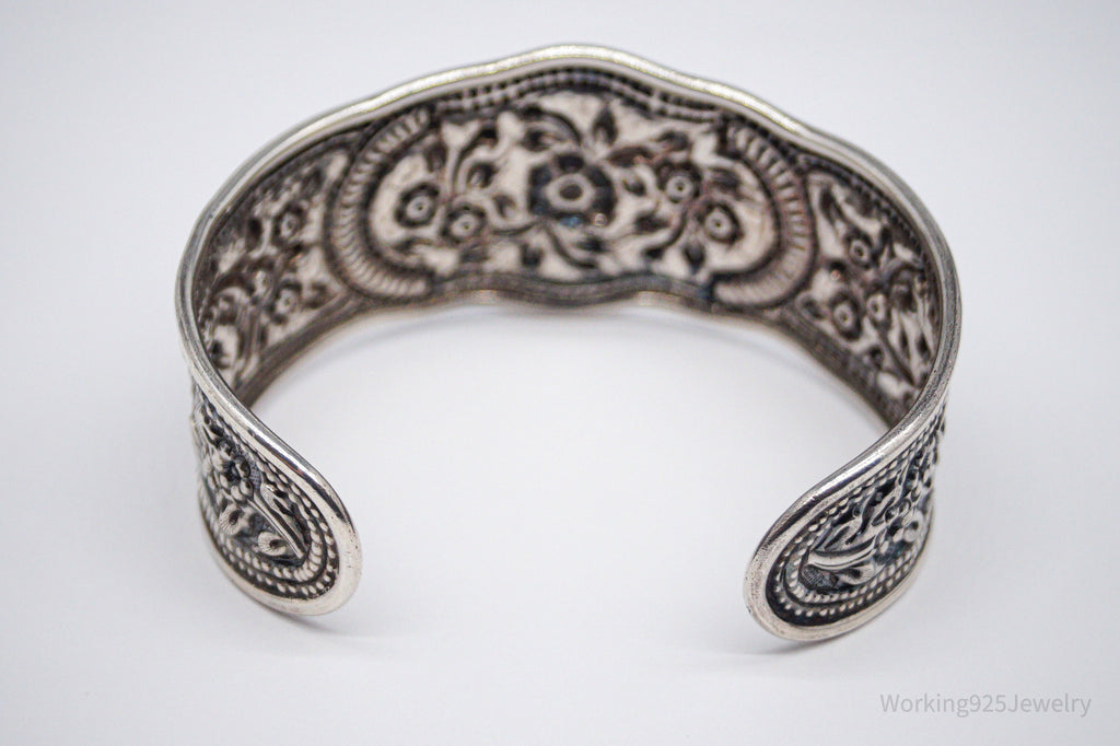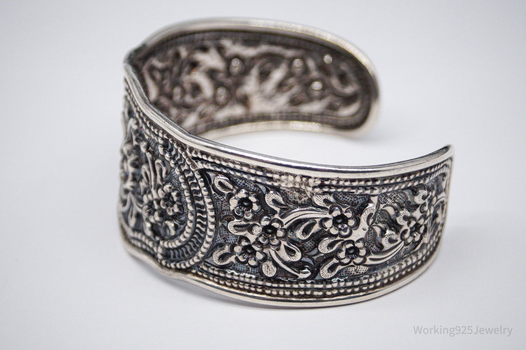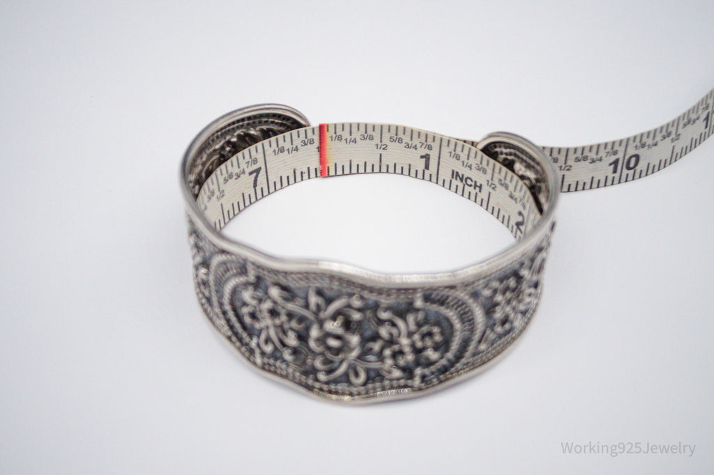 Vintage Floral Pattern Repousse Sterling Silver Cuff Bracelet 7.5"