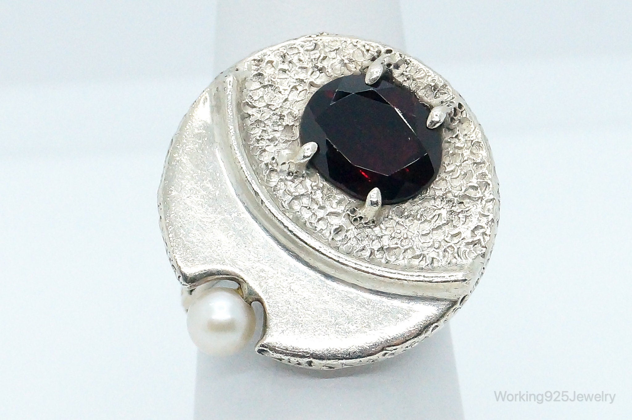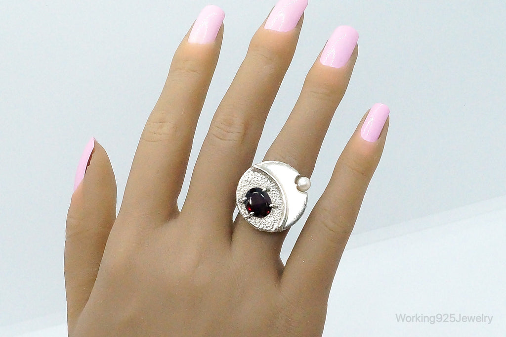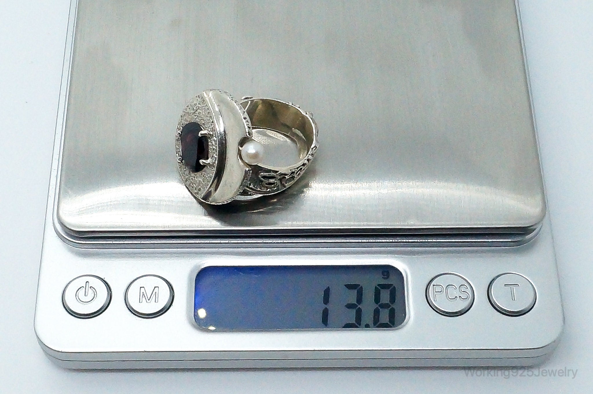 Vintage Garnet Pearl Sterling Silver Ring - Size 6