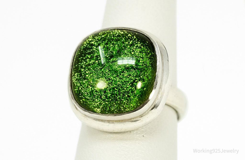 Vintage Green Dichroic Glass Sterling Silver Ring - Size 6